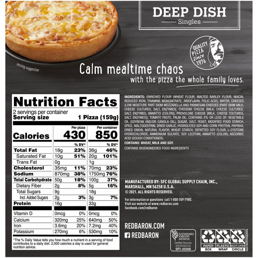 RED BARON Deep Dish Singles Four Cheese Pizza – Our single serve cheese pizzas are perfect for on-the-go and ready to enjoy in minutes. Savor the mouthwatering taste of zesty tomato sauce and real mozzarella, cheddar, provolone, and parmesan cheese, all piled on top of our crispy, indulgently thick deep-dish crust. Our delicious, melty four cheese personal pizzas are crispy and delicious in minutes, so you can be on the go in no time. Whether it’s part of a mid-week dinner or a late-night study session with friends, our single-serve frozen pizzas are ready when you need them. Easy to make and easier to enjoy, these deep-dish single pizzas serve up quality and flavor in minutes so you can get back to what matters. With two individual frozen pizzas per package, you can choose to make one or both. Just bake the frozen pizza in the oven for 21-23 minutes at 375°F or microwave for 2.5-3.5 minutes. In no time you’re ready to enjoy a crispy, melty and perfectly crunchy cheese pizza single that will satisfy you on the go. Keep individual pizzas frozen until you’re ready to enjoy. No matter the occasion, you can count on RED BARON. You can quickly bake our frozen single serve pizzas as part of an easy dinner, microwave them in minutes and take them with you wherever you’re headed. Our frozen personal pizzas are so simple to make, giving you more time to focus on the people and moments that matter. Make on-the-go easier with a RED BARON Deep Dish Singles Four Cheese Pizza!
