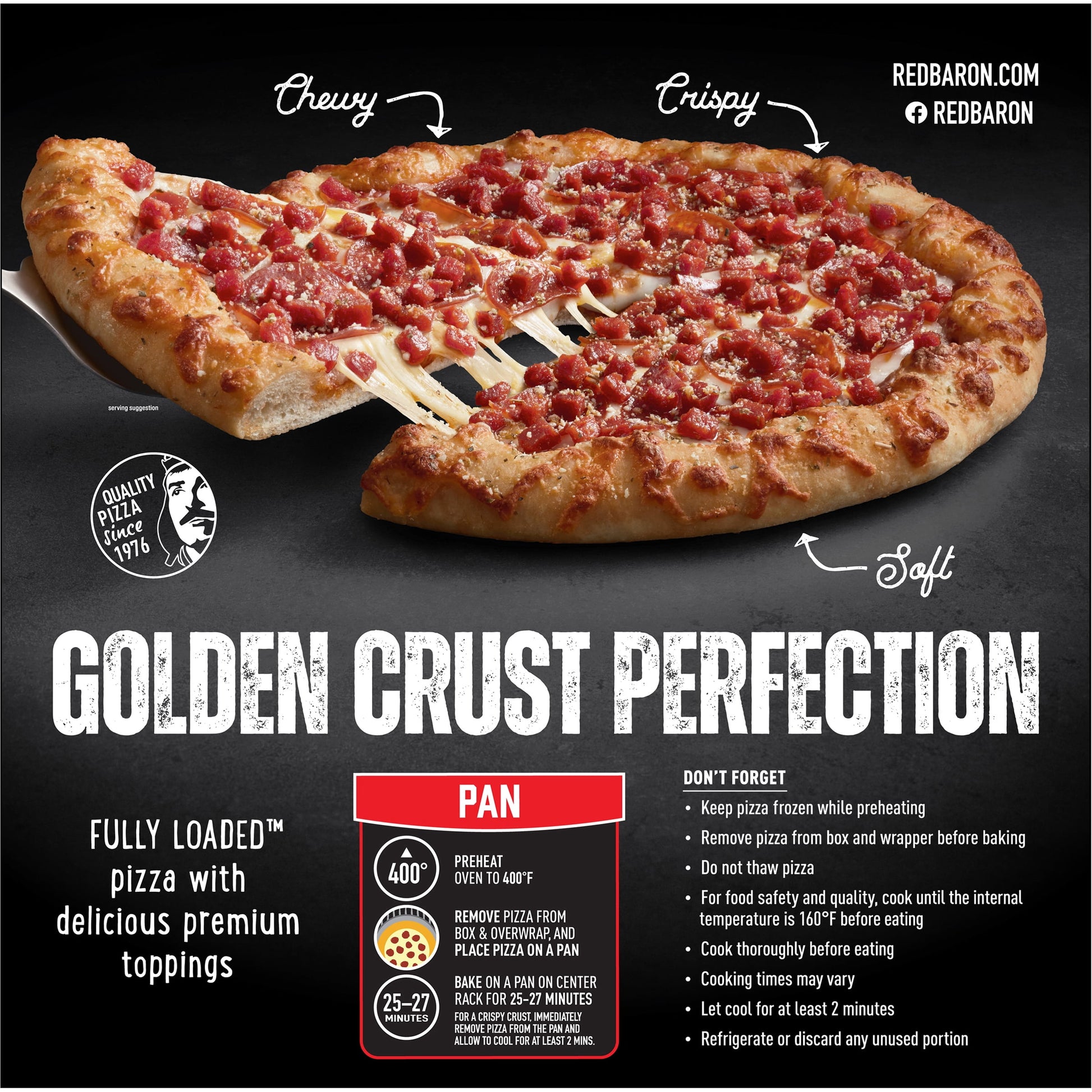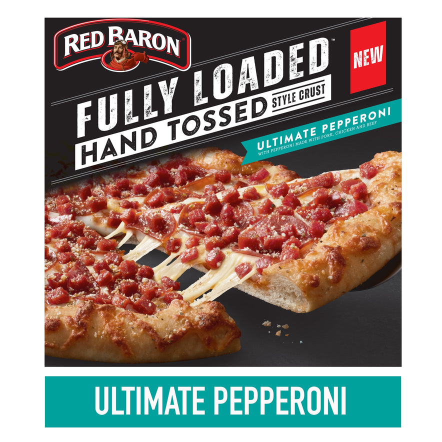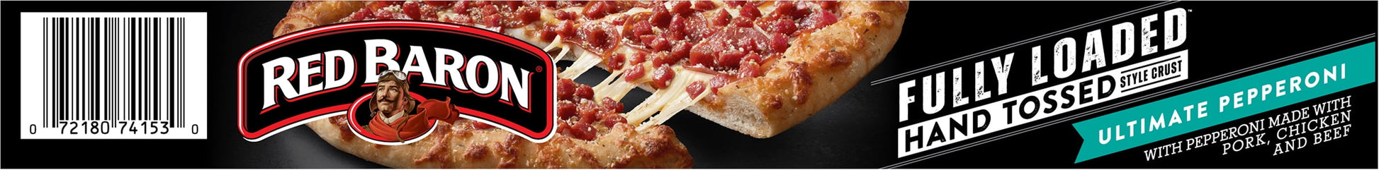 RED BARON FULLY LOADED Hand Tossed Style Ultimate Pepperoni Pizza - One bite into our Hand Tossed Style Ultimate Pepperoni pizza and you know this will be a moment to remember. Our Hand Tossed Style pizza crust will soon become your favorite in the frozen aisle; the golden crust bakes to pillowy, chewy perfection. Fully loaded with a half-pound of delicious, premium toppings, you'll savor the taste of mozzarella and cheddar cheeses and three cuts of pepperoni: sliced, diced & quartered, all piled on top of our Hand Tossed Style Crust. Our FULLY LOADED Hand Tossed Ultimate Pepperoni pizza is an excellent source of protein and is made with real cheese so you can feel good about every single slice you serve. Whether it's part of a mid-week family dinner, a late-night study session with friends, or a quick snack before sports practice, let our frozen pizzas help you and the people you love savor every moment. Easy to make and easier to enjoy, this frozen pizza serves up quality and flavor in minutes so you can get back to what matters. Just bake this frozen pizza on a baking pan for 25-27 minutes at 400?F and you're ready to serve a savory and indulgent Ultimate Pepperoni Pizza that will satisfy everyone around your table. Keep pizza frozen until you're ready to enjoy. No matter the occasion, you can count on RED BARON pizza to please the crowd. You can quickly bake our frozen pizza as part of an easy dinner, giving your family more time to catch up over every cheese and meat-packed bite. Everyone at your next pizza party will buzz about the hand tossed style crust. And you'll feel the pride and excitement that comes with bringing people together to share a delicious meal-and lots of memorable moments-again and again. Make your next meal mean more with a RED BARON FULLY LOADED Hand Tossed Style Ultimate Pepperoni Pizza!