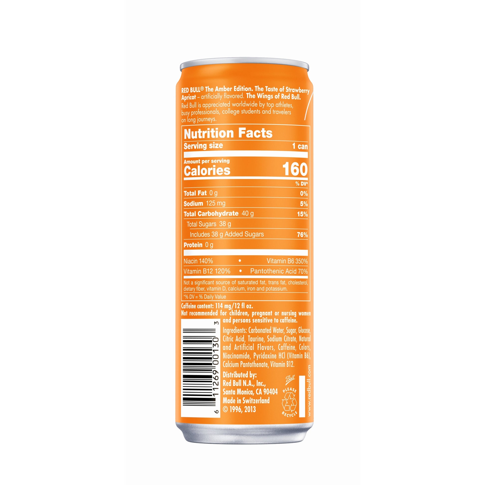 Red Bull Amber Edition Strawberry Apricot Energy Drink gives you Wiiings whenever you need them. Red Bull Amber Edition is a lightly carbonated energy drink with caffeine, taurine, B vitamins, real sugar and water, along with the perfect blend of strawberry and apricot flavors with a touch of peach taste.* With 160 calories per 12 fl oz can, Red Bull is great for any occasion. While aiming for great heights during your workday, in your workouts or when gaming, why not crack open a refreshing can of Red Bull? Drink Red Bull straight from the can or enjoy in a glass over ice. This can of Red Bull will keep you ready for any occasion, whether it’s hanging with friends, watching the game or going on a road trip. Be ready for the big moments with a can of Red Bull. Store this can of Red Bull at room temperature or toss it in the fridge. Red Bull gives you Wiiings.