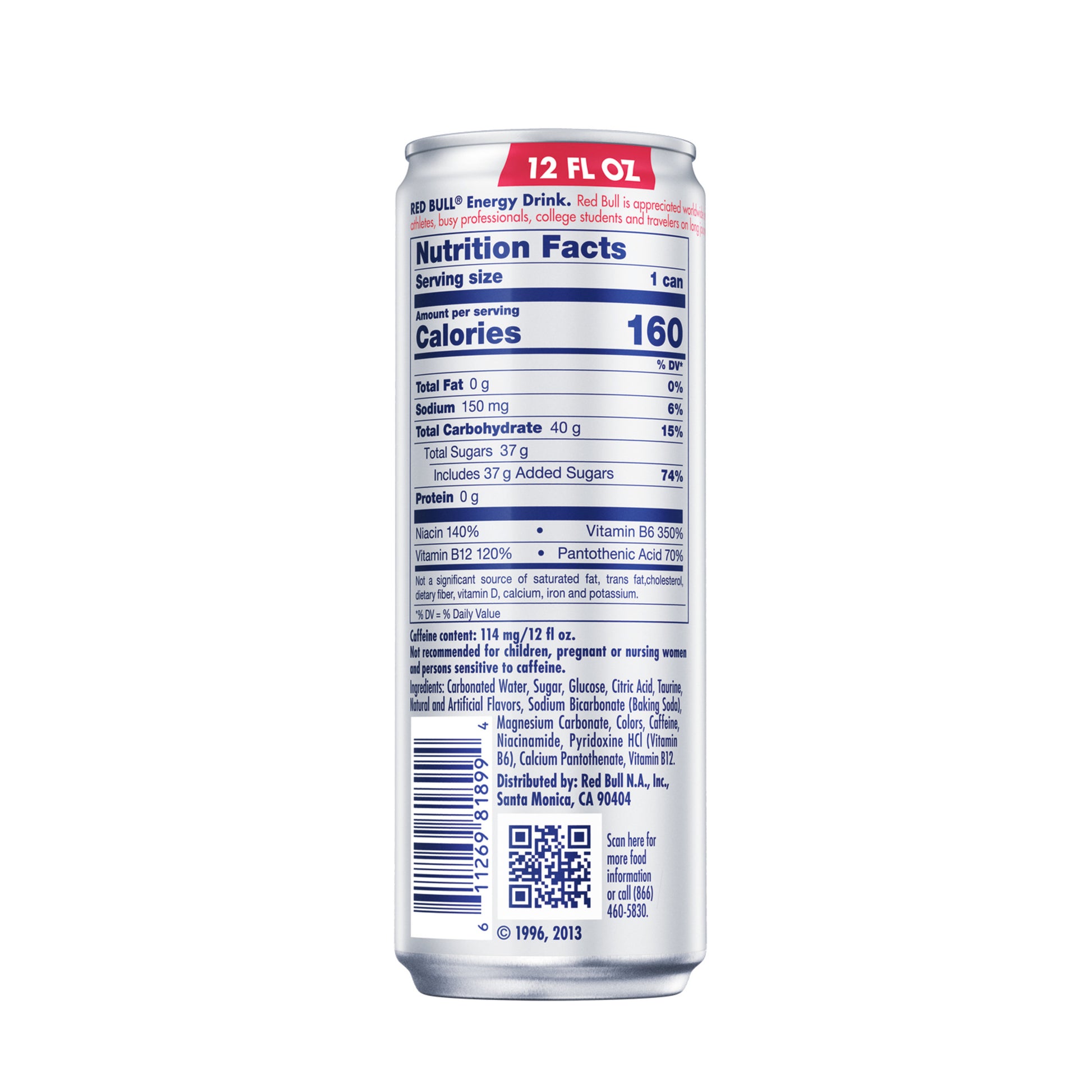 Each 12 fl oz can of Red Bull Energy Drink contains 114 mg of caffeine, about the same amount as in an equal serving of home-brewed coffee