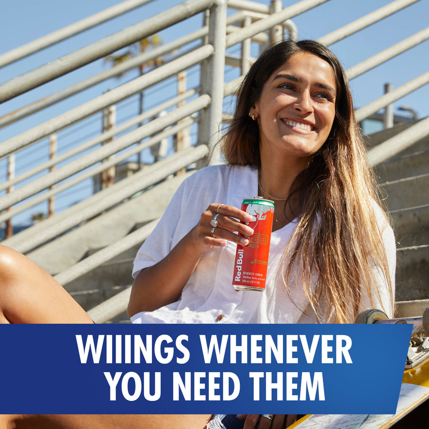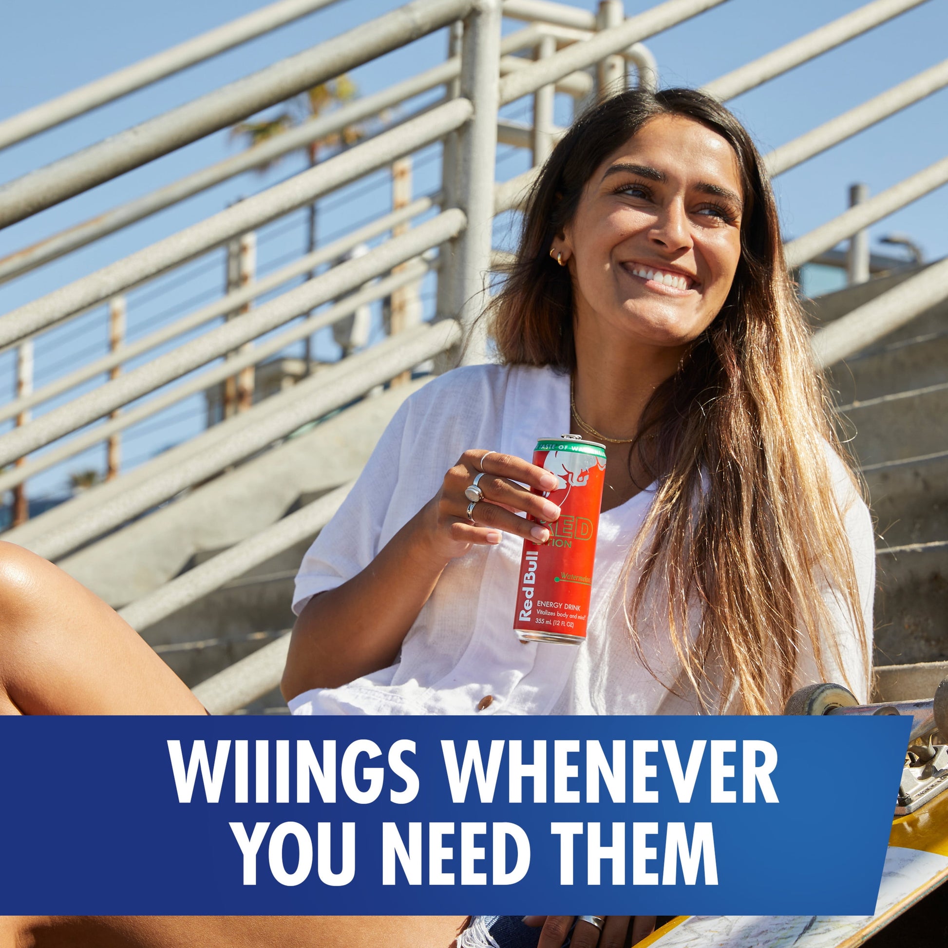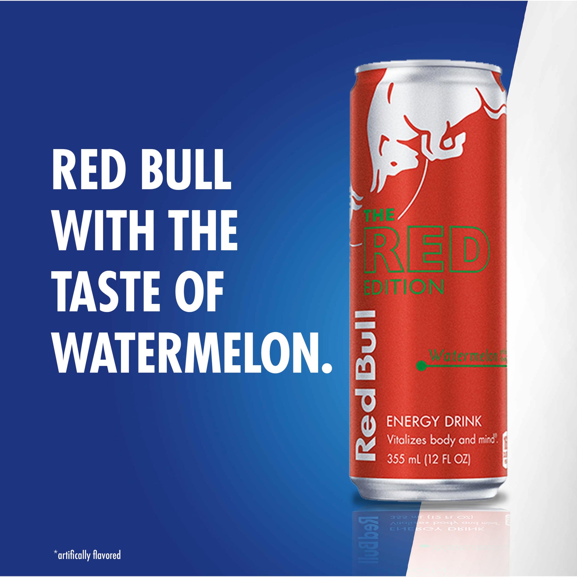 Red Bull Red Edition Watermelon Energy Drink gives you Wiiings whenever you need them. Red Bull Red Edition is a lightly carbonated energy drink with a blend of caffeine, taurine, B vitamins, real sugar and water, along with the taste of watermelon.* With 160 calories per 12 fl oz can, Red Bull is great for any occasion. While aiming for great heights during your workday, in your workouts or when gaming, why not crack open a refreshing can of Red Bull? Drink Red Bull straight from the can or enjoy in a glass over ice. This can of Red Bull will keep you ready for any occasion, whether it’s hanging with friends, watching the game or going on a road trip. Be ready for the big moments with a can of Red Bull. Store this can of Red Bull at room temperature or toss it in the fridge. Red Bull gives you Wiiings.