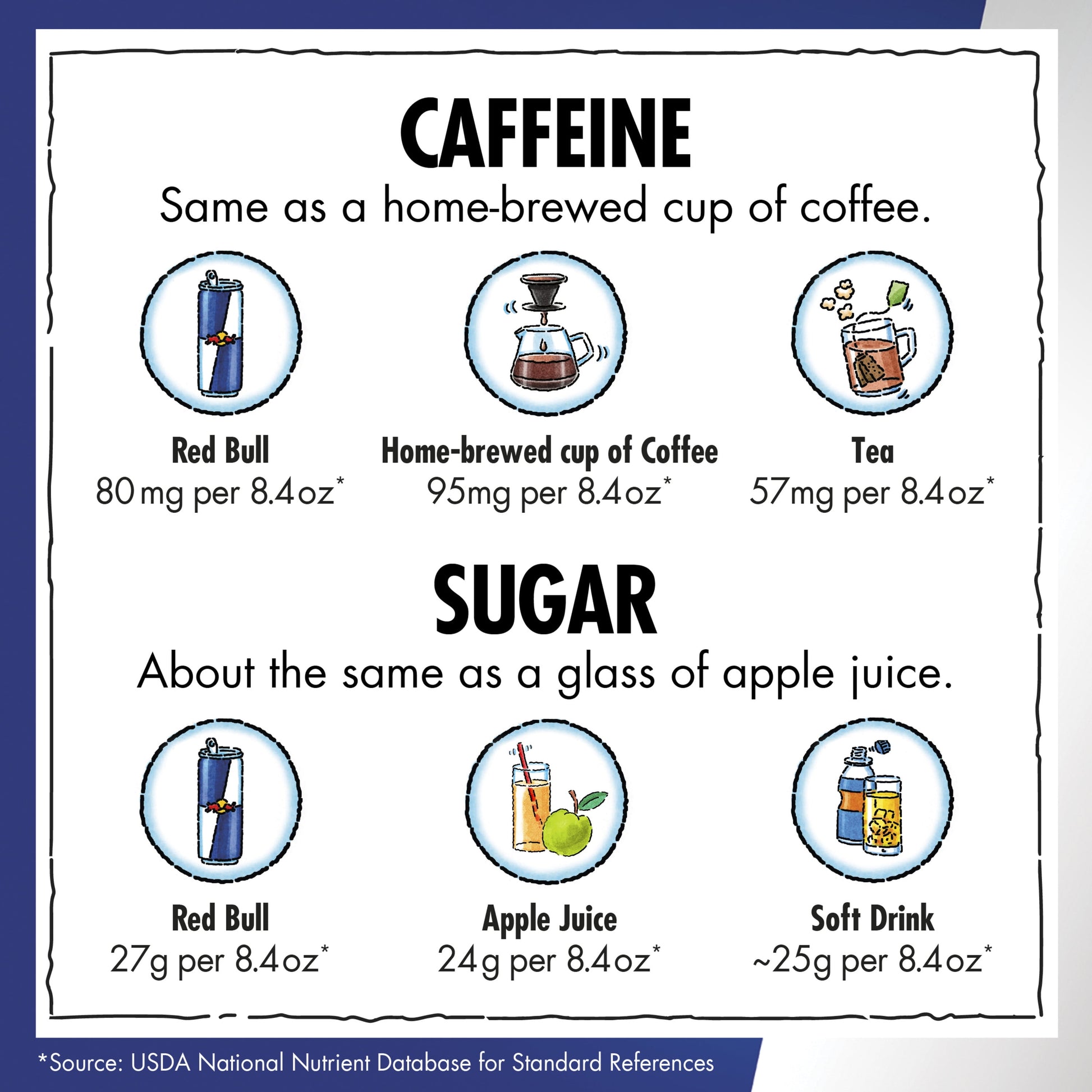 Each 8.4 fl oz can of Red Bull Energy Drink contains 80 mg of caffeine per serving, about the same amount of caffeine as a home-brewed cup of coffee