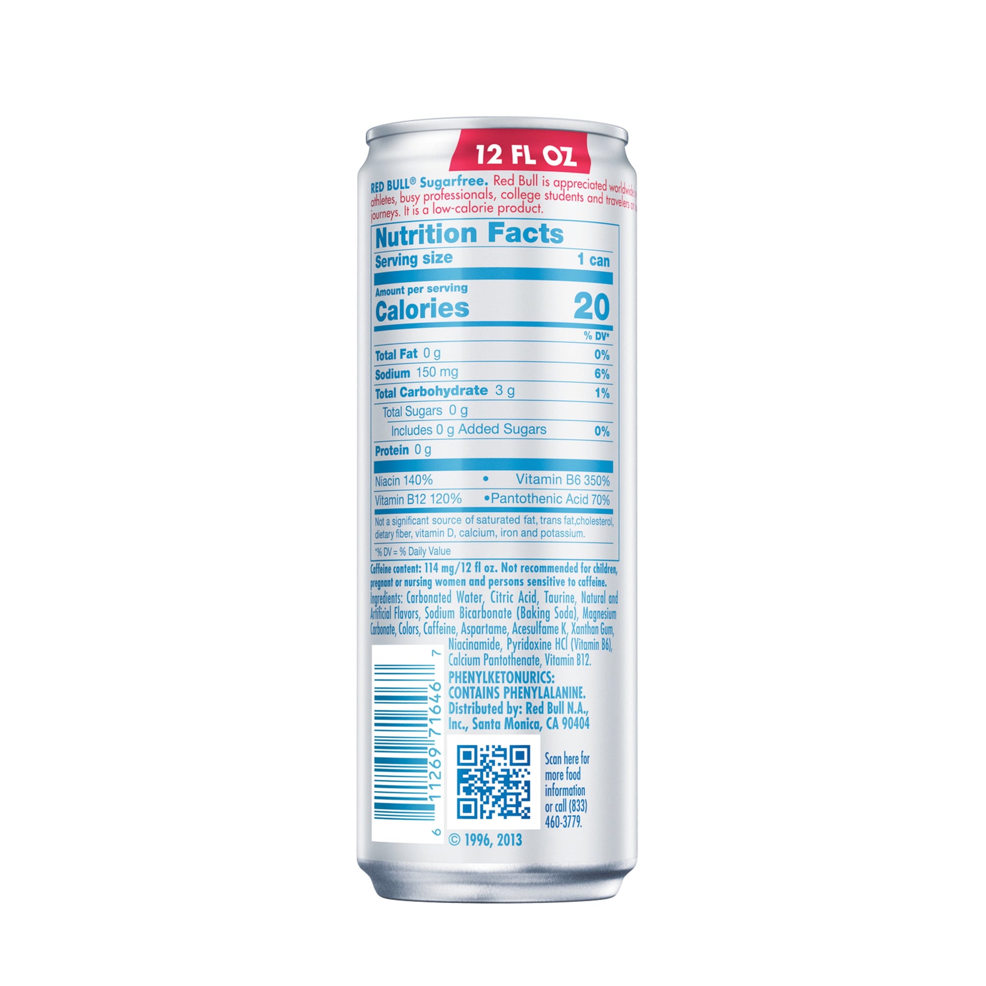 Red Bull Sugar Free Energy Drink gives you Wiiings whenever you need them. Red Bull Sugar Free is a lightly carbonated energy drink made with caffeine, taurine, B vitamins and water, that brings you the same taste and good times of Red Bull. Sweetened with acesulfame-potassium K and sucralose, Red Bull Sugar Free has 20 calories per 12 fl oz can for a low calorie energy drink. While aiming for great heights during your workday, in your workouts or when gaming, why not crack open a refreshing can of Red Bull? Drink sugar free Red Bull straight from the can or pour into a glass over ice. This can of Red Bull will keep you stocked for any occasion, whether it’s hanging with friends, watching the game or going on a road trip. Be ready for the big moments with a can of Red Bull. Store this can of Red Bull at room temperature or toss it in the fridge. Red Bull gives you Wiiings.