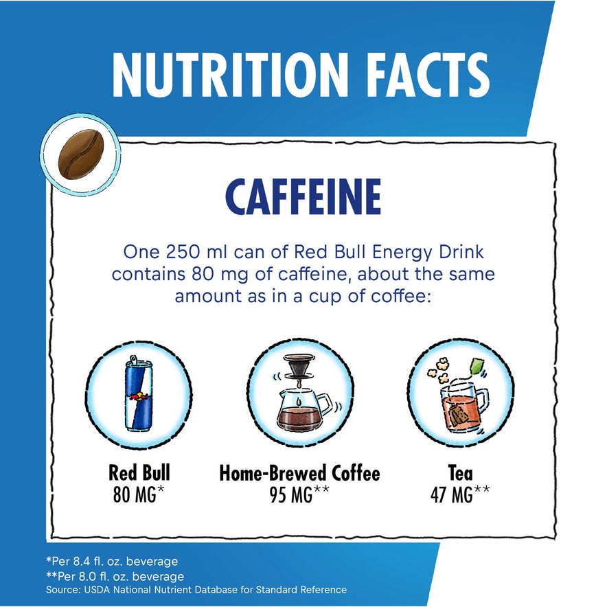 Red Bull Sugar Free Energy Drink contains 80 mg of caffeine per serving, about the same amount of caffeine as a cup of home-brewed coffee