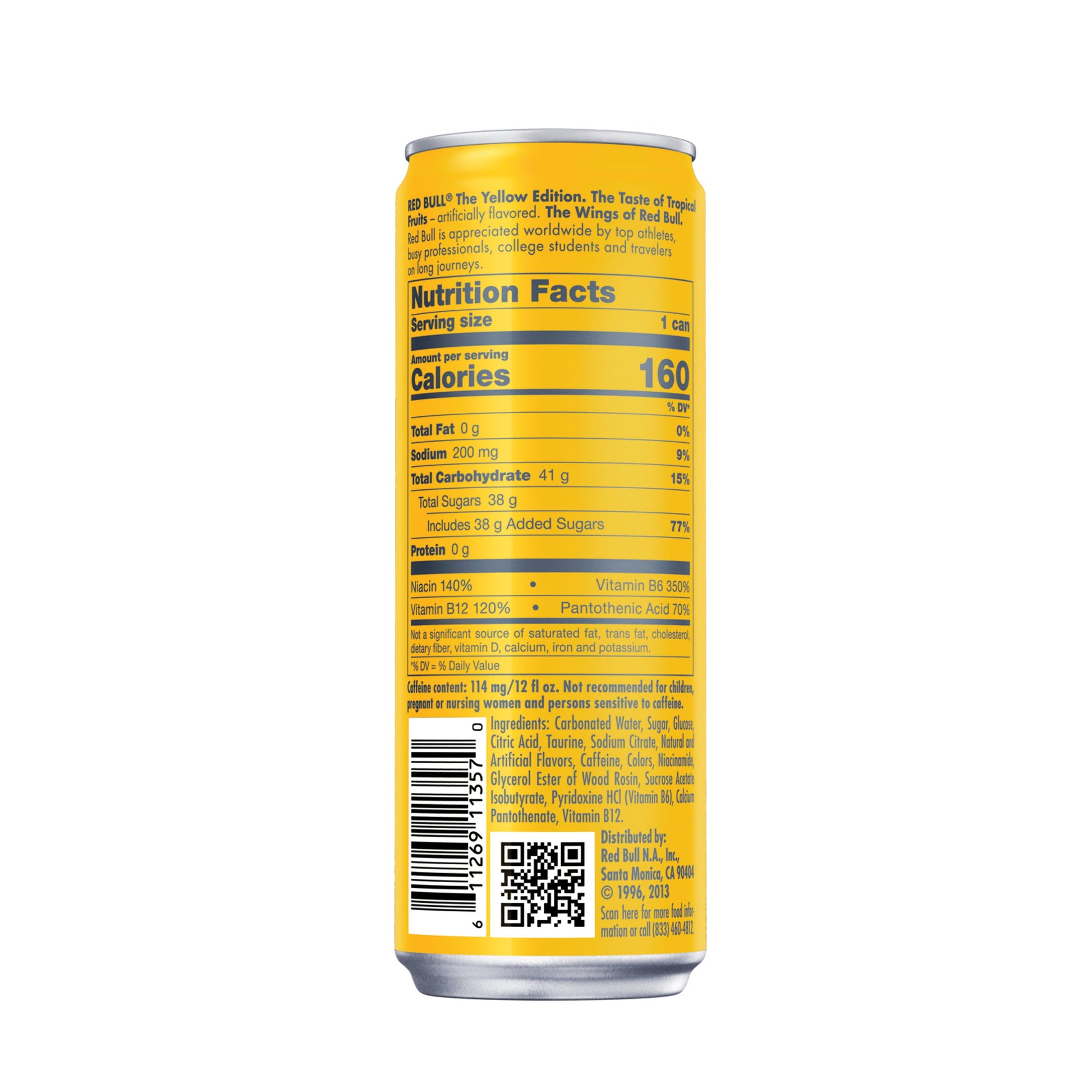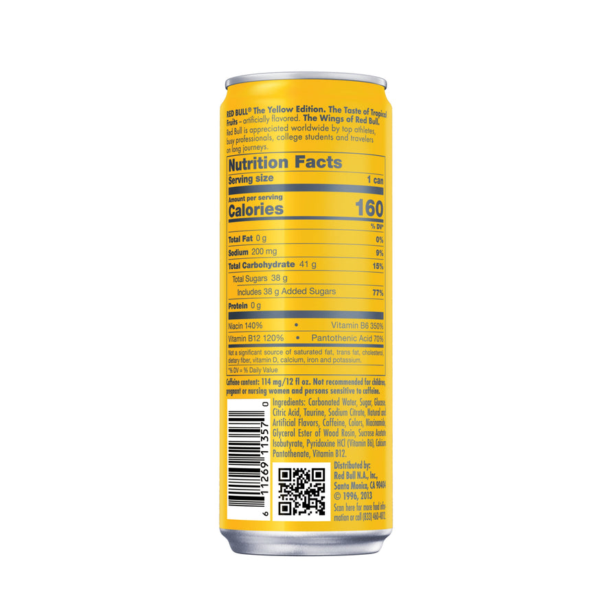 Red Bull Yellow Edition Tropical Energy Drink gives you Wiiings whenever you need them. Red Bull Yellow Edition is a lightly carbonated energy drink with a blend of caffeine, taurine, B vitamins, real sugar and water, along with a perfect blend of tropical fruit flavors.* With 160 calories per 12 fl oz can, Red Bull is great for any occasion. While aiming for great heights during your workday, in your workouts or when gaming, why not crack open a refreshing can of Red Bull? Drink Red Bull straight from the can or enjoy in a glass over ice. This can of Red Bull will keep you ready for any occasion, whether it’s hanging with friends, watching the game or going on a road trip. Be ready for the big moments with a can of Red Bull. Store this can of Red Bull at room temperature or toss it in the fridge. Red Bull gives you Wiiings.