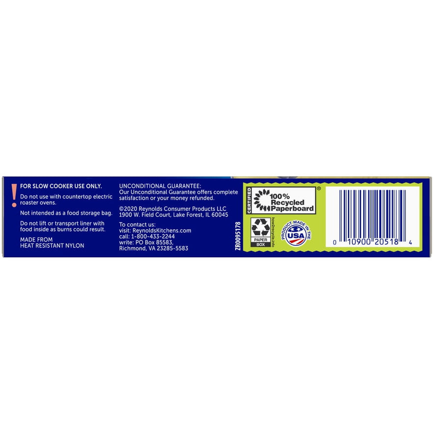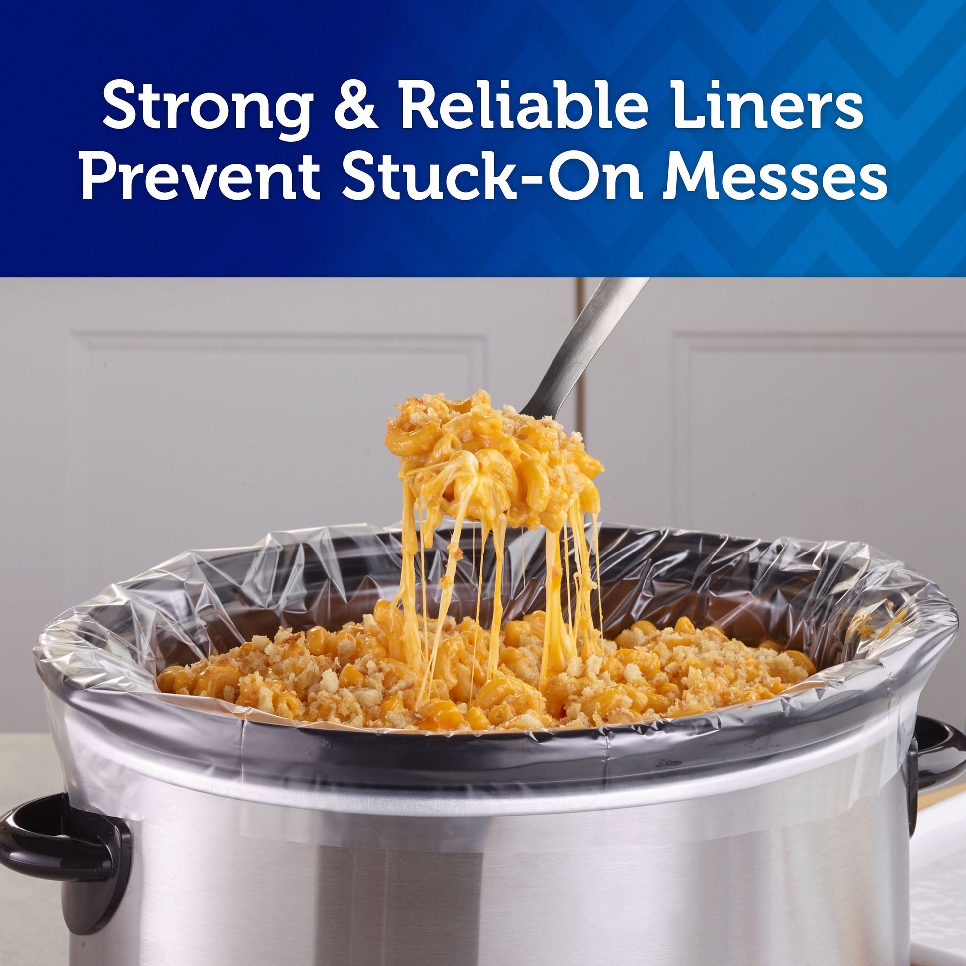 Make memorable meals with Reynolds Kitchens Slow Cooker Liners, and save time on cleanup. Grab these slow cooker bags for slow cooking without dealing with stubborn, stuck-on messes. Simply lift the slow cooker liner when the cooking is done and your slow cooker is clean in less than eight seconds—guaranteed! Each slow cooker bag measures 13 x 21 inches to fit 1- to 3-quart round and oval slow cookers, and is made with a BPA-free heat resistant (up to 400 degrees Fahrenheit) nylon-blend construction. Spend more time with your loved ones and less time in the kitchen with these FDA-compliant, food-safe Reynolds Kitchens Slow Cooker Liners.