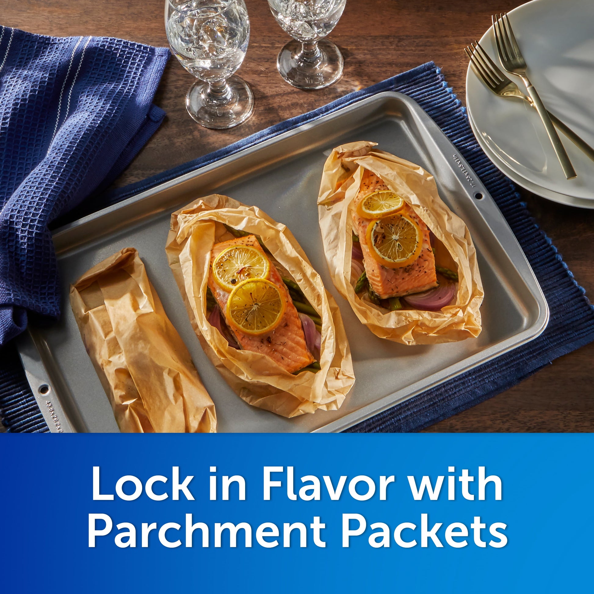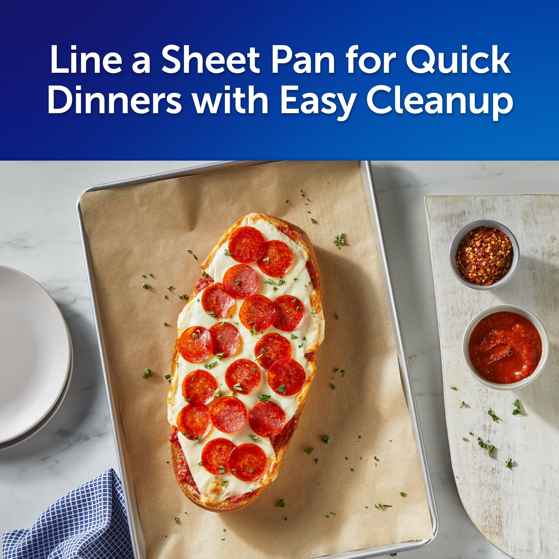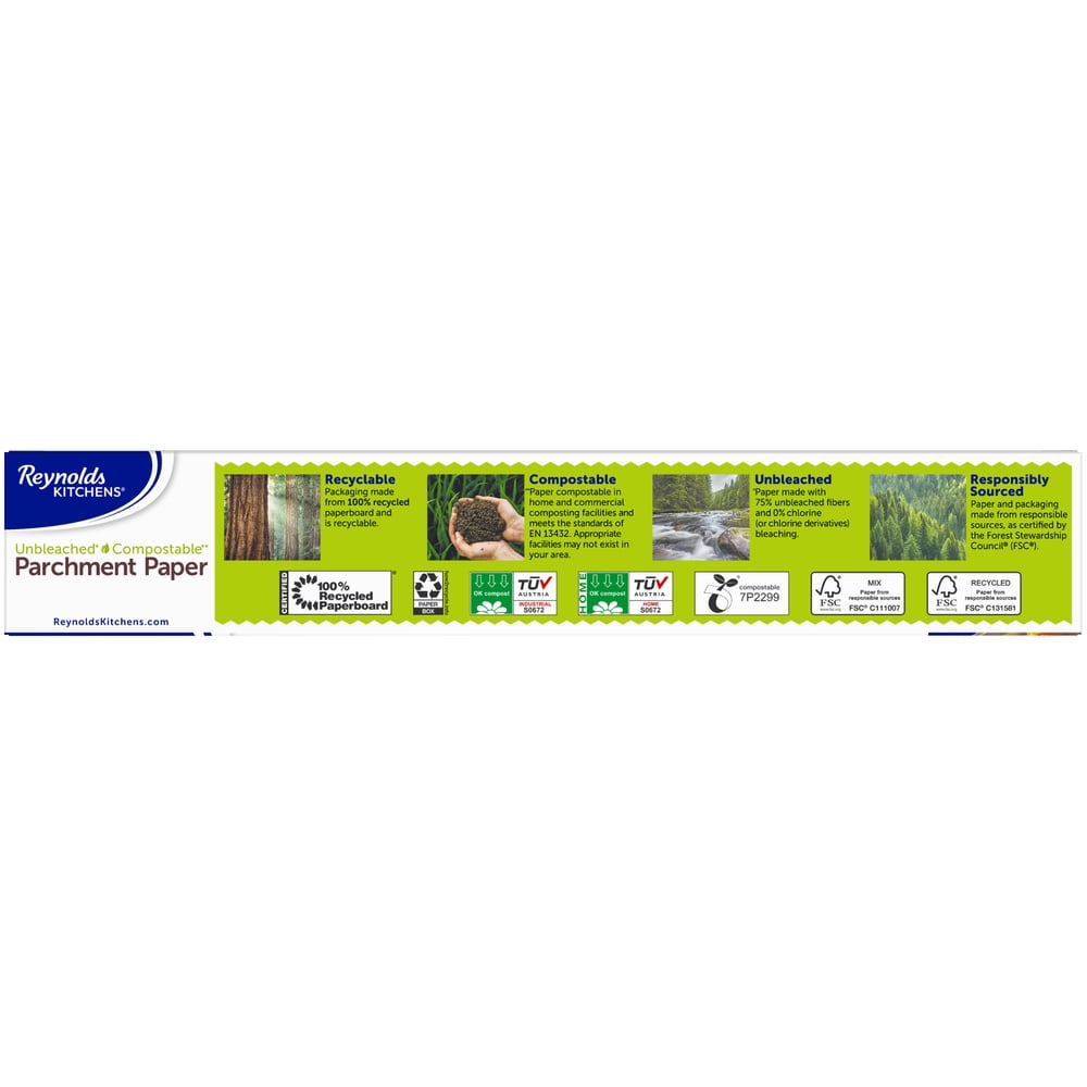 Reynolds Kitchens Unbleached Parchment Paper is a responsibly-sourced, totally chlorine-free cooking paper that is made with 75% unbleached fiber. This baking parchment is compostable in home & commercial composting facilities, & the packaging is fully recyclable for an eco-friendly choice. At 12-inches wide, this oven paper fits perfectly in most baking pans, so no trimming or folding is needed. Every Reynolds parchment paper roll is oven-safe up to 425 degrees Fahrenheit to help make everyday meals easy—& make clean-up quick! Cooking baked chicken, soft pretzels, pizza, bacon & more has never been easier with Reynolds Kitchens Unbleached Parchment Paper.