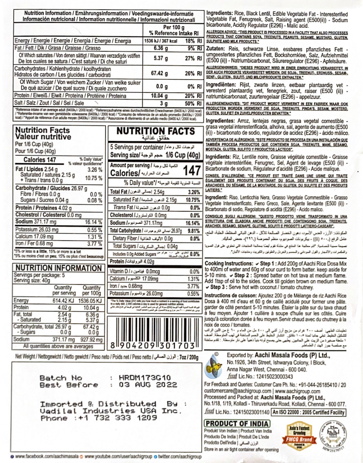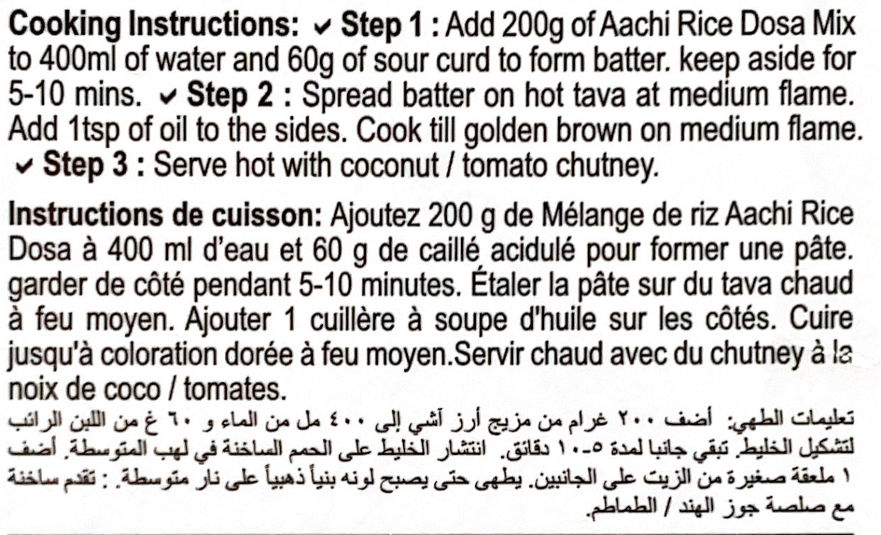 These thin, crepe-like pancakes are eaten with spicy potato fillings. Dosa mix is a blend of rice and lentil flours, ground urad dal, salt and spices. Dosa mixes are much more convenient because they save soaking and grinding time. This convenient mix can also be used to make thicker dosa called uttappam, which the batter is mixed with chopped onions and green chillies before cooking. Enjoy this with coconut chutney, rasam or sambhar. Recipes are provided on package.
