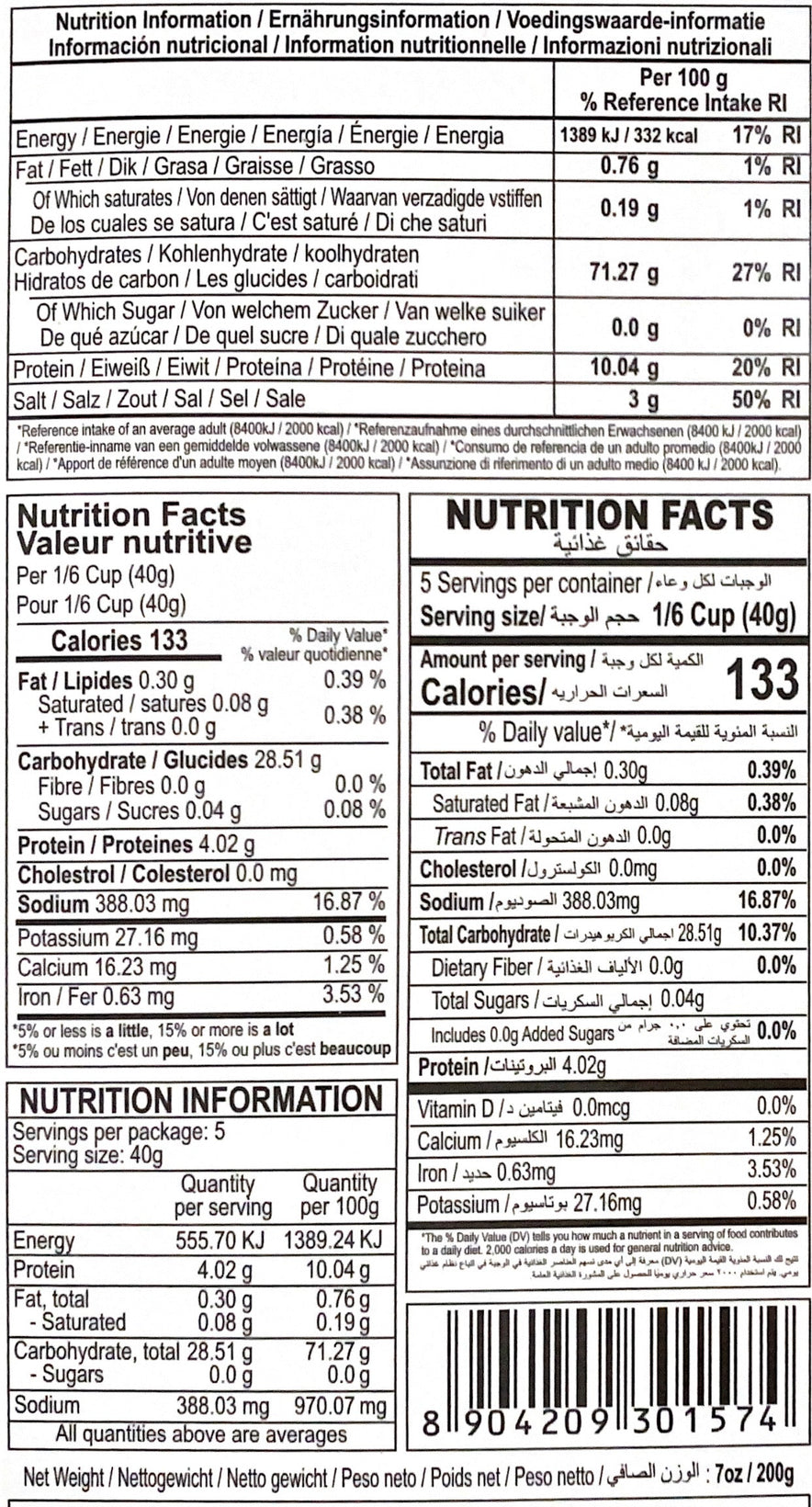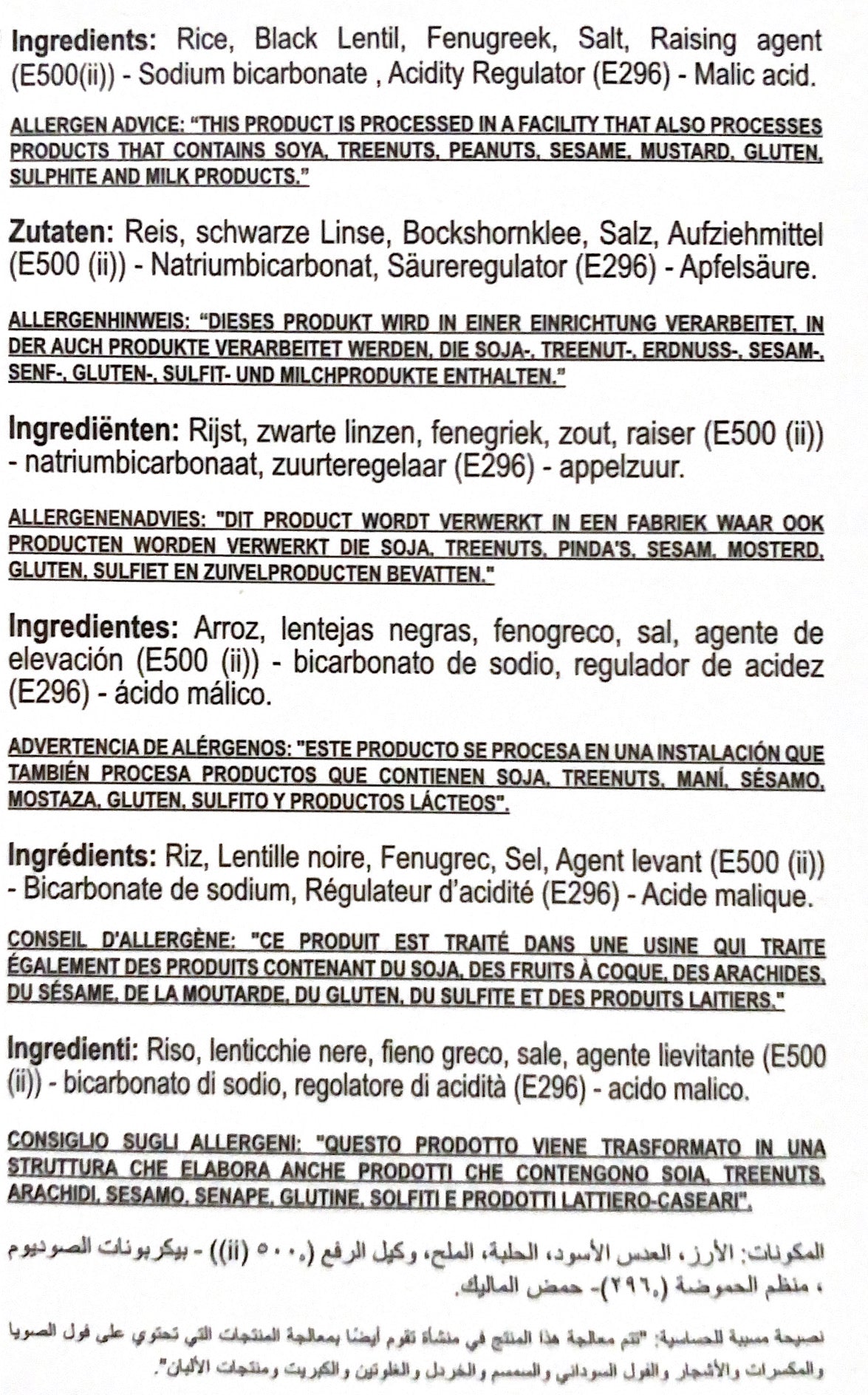 Rice, Black Lentil, Fenugreek, Salt, Raising agent (E500(ii)) – Sodium bicarbonate , Acidity Regulator (E296) – Malic acid.