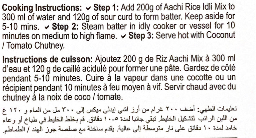 Step 1: Add 200g of Aachi Rice Idli Mix to 300 ml of water and 120g of sour curd to form batter. Keep aside for 5-10 mins. Step 2: Steam batter in idly cooker or vessel for 10 minutes on medium to high flame. Step 3: Serve hot with Coconut / Tomato Chutney.