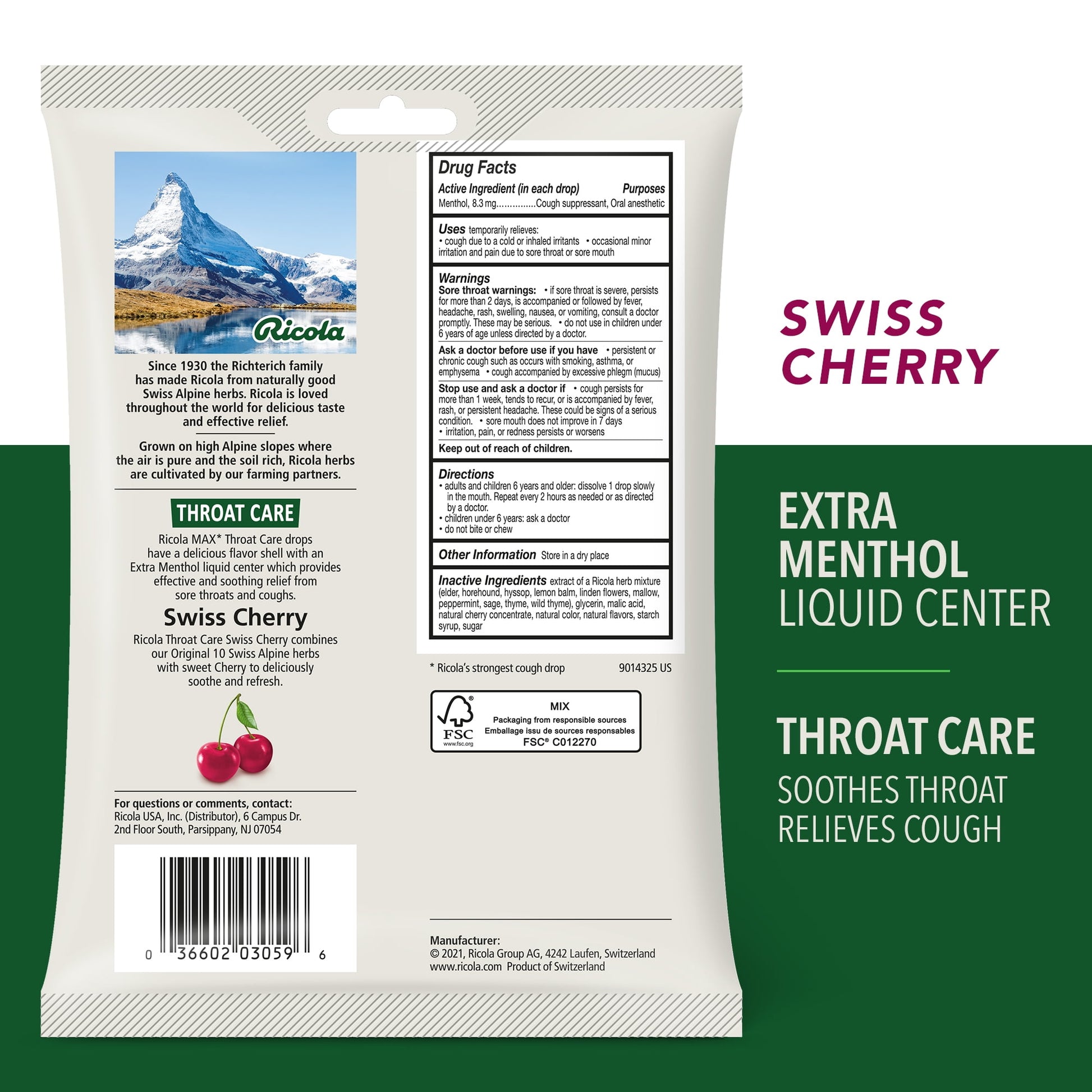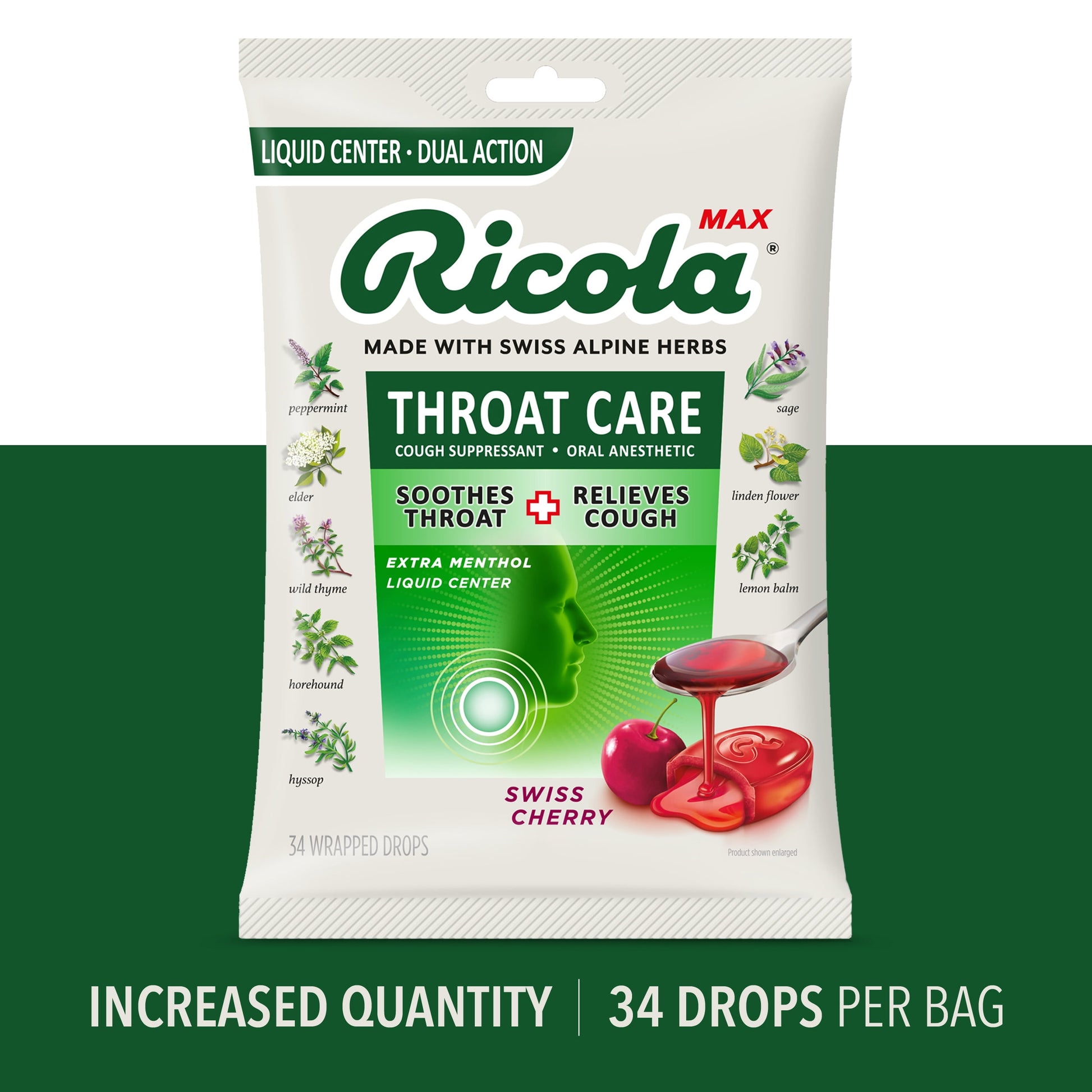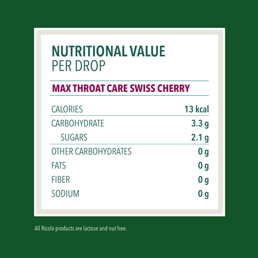 Ricola Max Care Swiss Cherry combines the world-famous Ricola original 10 Swiss Alpine herbs with sweet cherry to deliciously soothe coughs and refresh sore throats. Ricola Max Throat Care cough drops and throat drops have a delicious flavor shell with an Extra Menthol liquid center which provides effective and soothing from sore throats and coughs. For nearly a century, Ricola has been helping throats around the world feel better. World-famous Ricola herb cough drops are made with 10 high-quality herbs grown high in the Swiss mountains, each with uniquely distinct traits. Ricola helps support you with soothing relief.