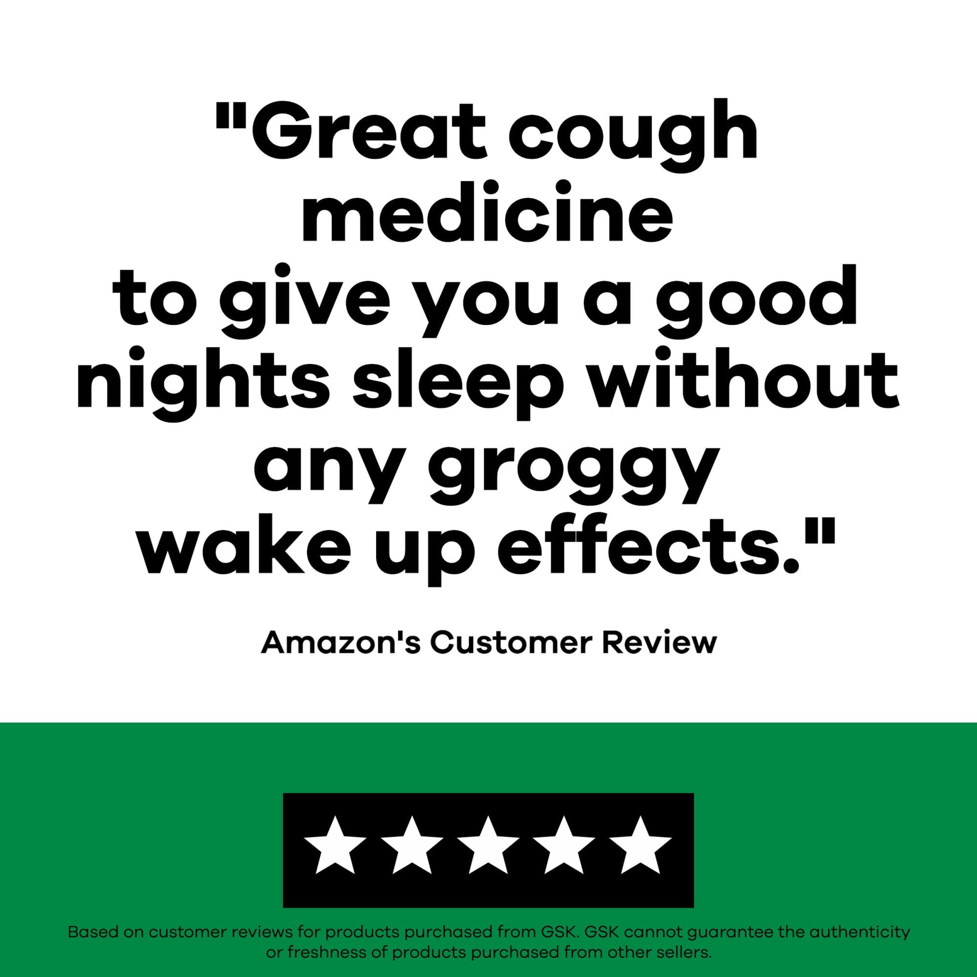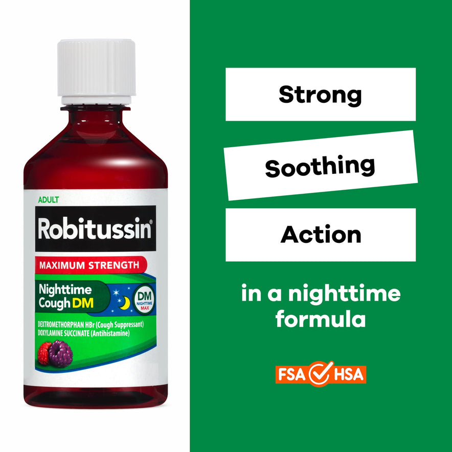 Robitussin Maximum Strength Nighttime Cough DM is a cough medicine for adults that delivers the reliable, soothing impact of its original formula in a great-tasting, fruity flavor. Developed with the taste of berry and formulated to tackle your cough symptoms, this liquid cough suppressant goes down quickly and helps you get on your way to a good night's sleep. Take 20 mL of Robitussin Cough Suppressant by mouth every six hours while symptoms persist. In addition to providing temporary relief for cough caused by colds, this nighttime cold medicine also works as an antihistamine and helps control and relieve runny noses and sneezing as well. Suited for adults and children 12 years and over, keep Robitussin near your bedside for when nighttime cold symptoms strike. This night time cough syrup is specially formulated to control the impulse to cough as you sleep, allowing you to get a good's night rest and put you on the path to recovery. Delivering cough relief for more than 70 years, Robitussin has the product you need to treat your specific cough, cold, sore throat or flu symptoms for day and night relief. Robitussin shuts coughs down.