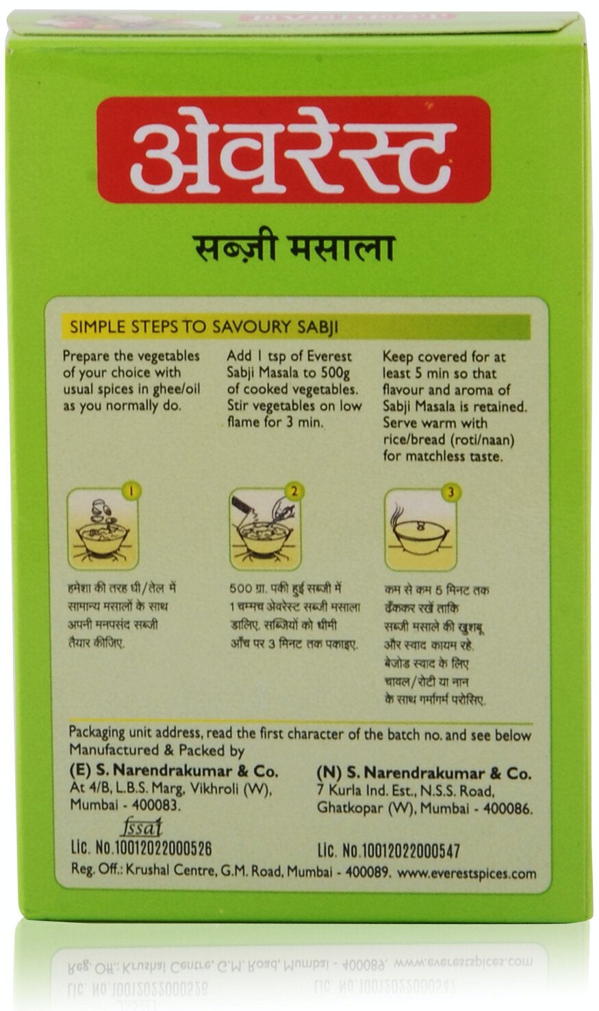 Everest Sabji Masala also adds a very distinctive and unique taste and flavour when used in the preparation of vegetable, lentils, grams, kachoris, pakodas, farsans, pattice, samosas, potato wadas, etc.