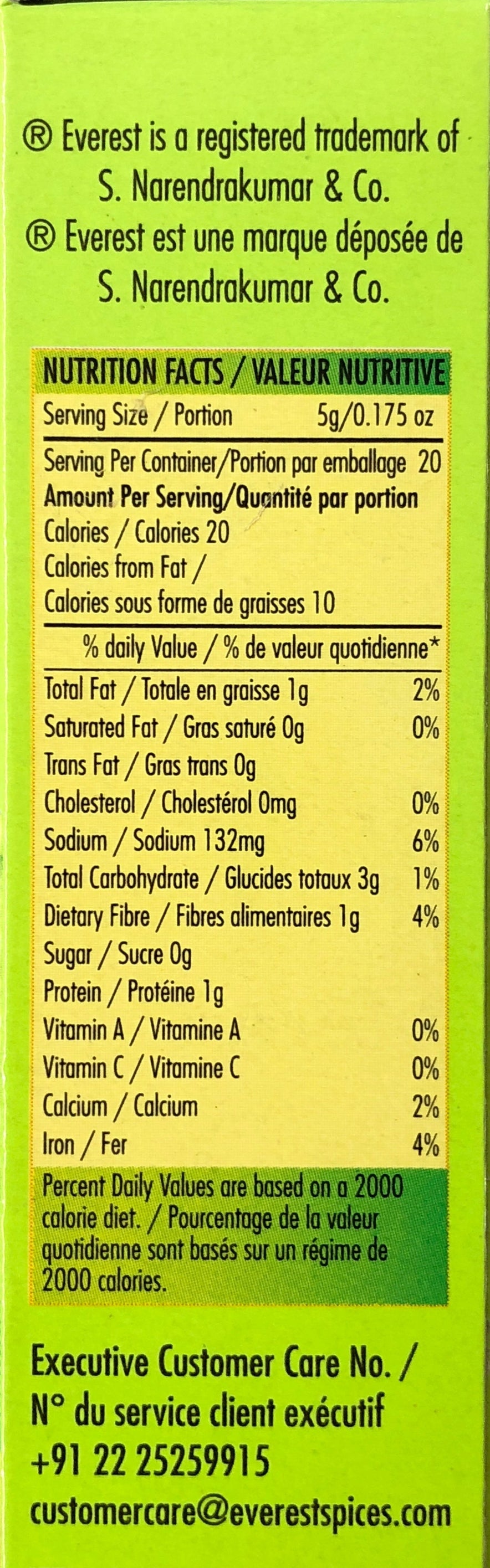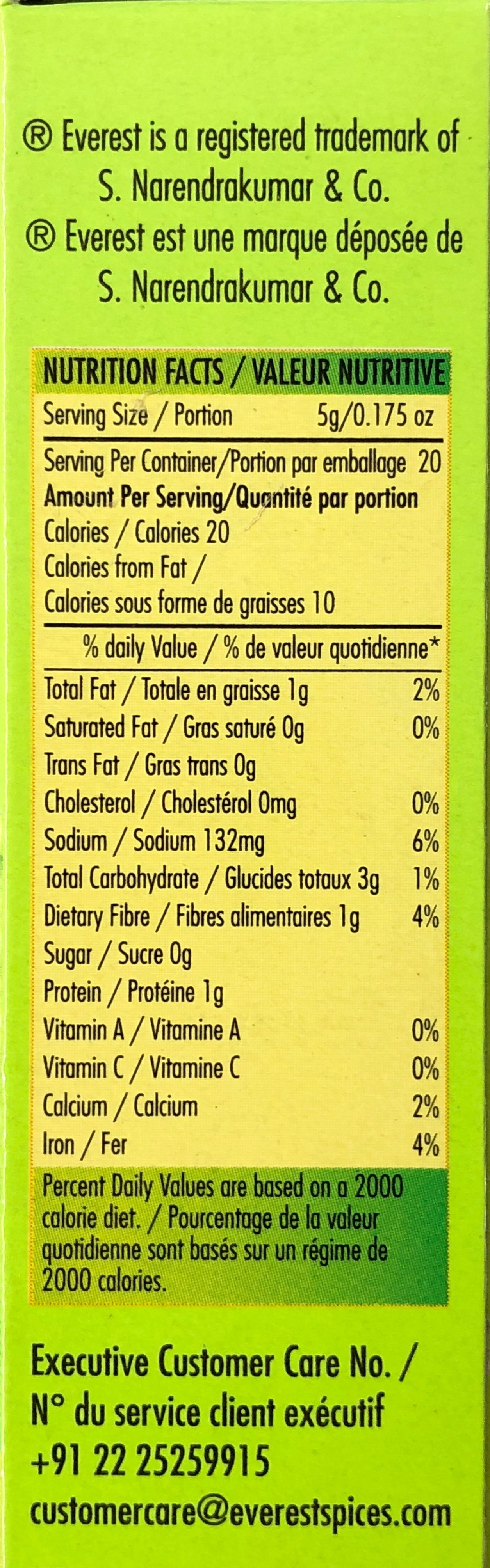 If you need to rustle up a quick vegetable curry, all you need is your favourite vegetable/s and Everest Sabji Masala, the 'one-stop' masala. That's right, you do not need any other spice to make your dishes tempting and irresistible. Everest Sabji Masala is just the right handy must-have for all those who simply don't have the time for elaborate cooking, but would like to prepare delicious, appetising vegetable dishes all the same.