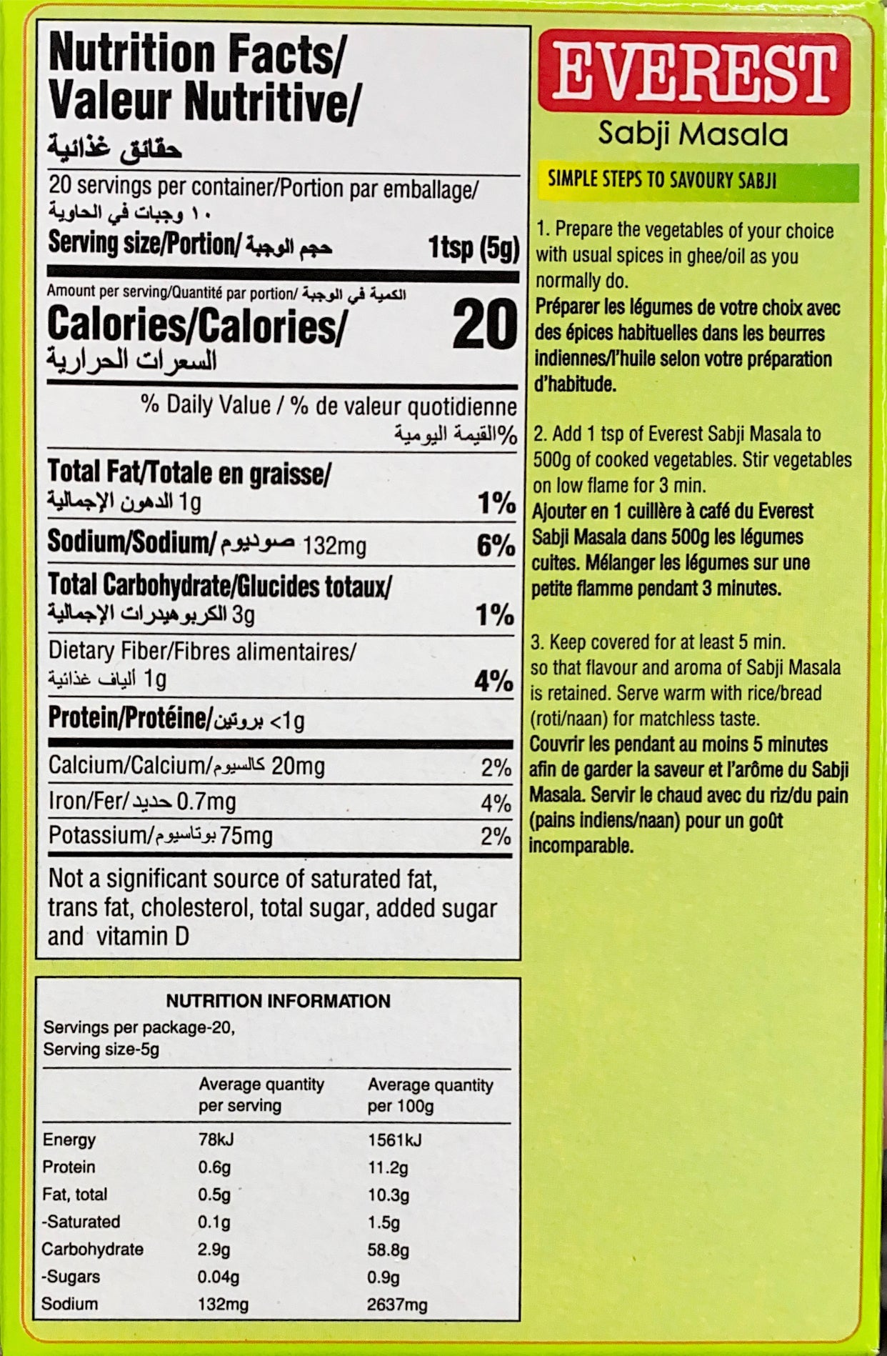 A subtle blend of spice specially combined to enhance the taste of vegetable dishes. Everest Sabji Masala is virtually the fast-food equivalent in the range of Everest blended spices. It gives vegetable dishes a mildly resonant flavour and the appetising colour so characteristic of vegetarian fare.