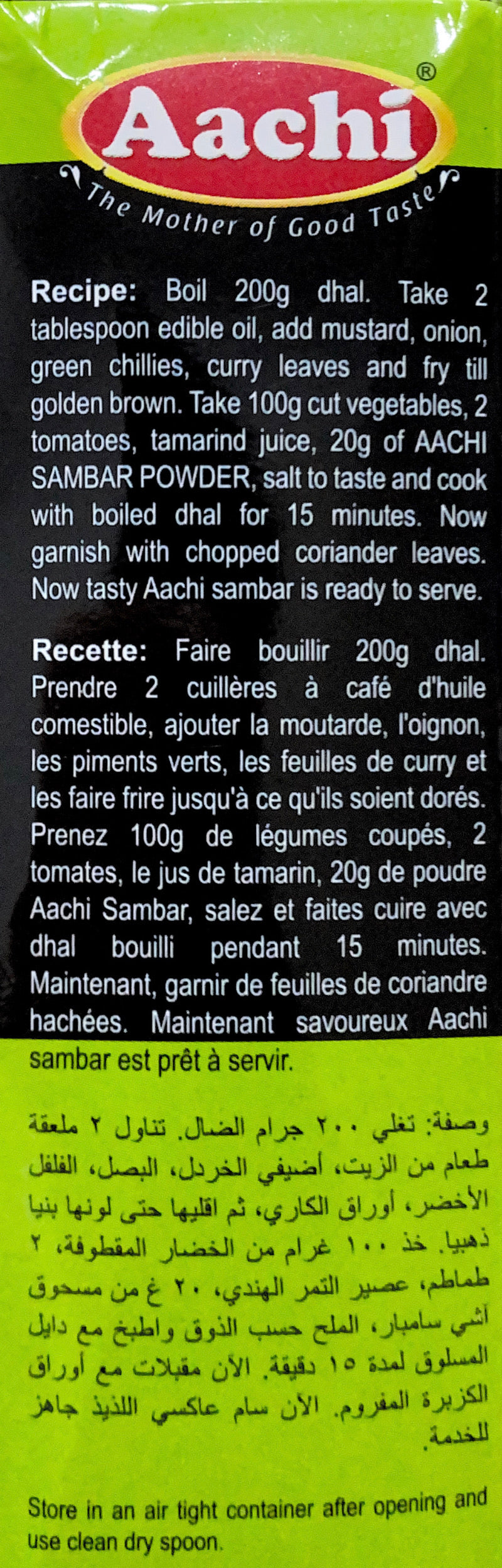 Aachi Sambar Powder is known through-out India for being an authentic composition of spices to create truly tasty and flavorful Sambar dishes.