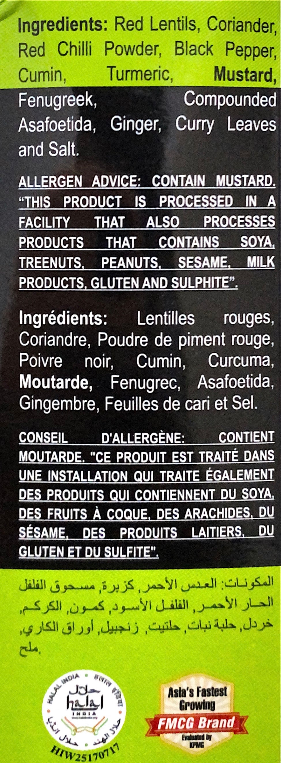 Toor Dal, Urad Dal, Coriander, Red Chilies, Pepper, Mustard, Ginger, Cumin, Fenugreek, Asafetida, Turmeric, Curry Leaves and Salt.
