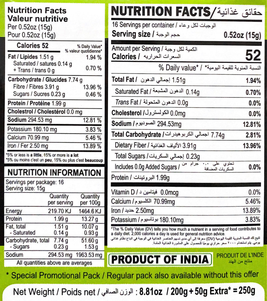 Toor Dal, Urad Dal, Coriander, Red Chilies, Pepper, Mustard, Ginger, Cumin, Fenugreek, Asafetida, Turmeric, Curry Leaves and Salt.