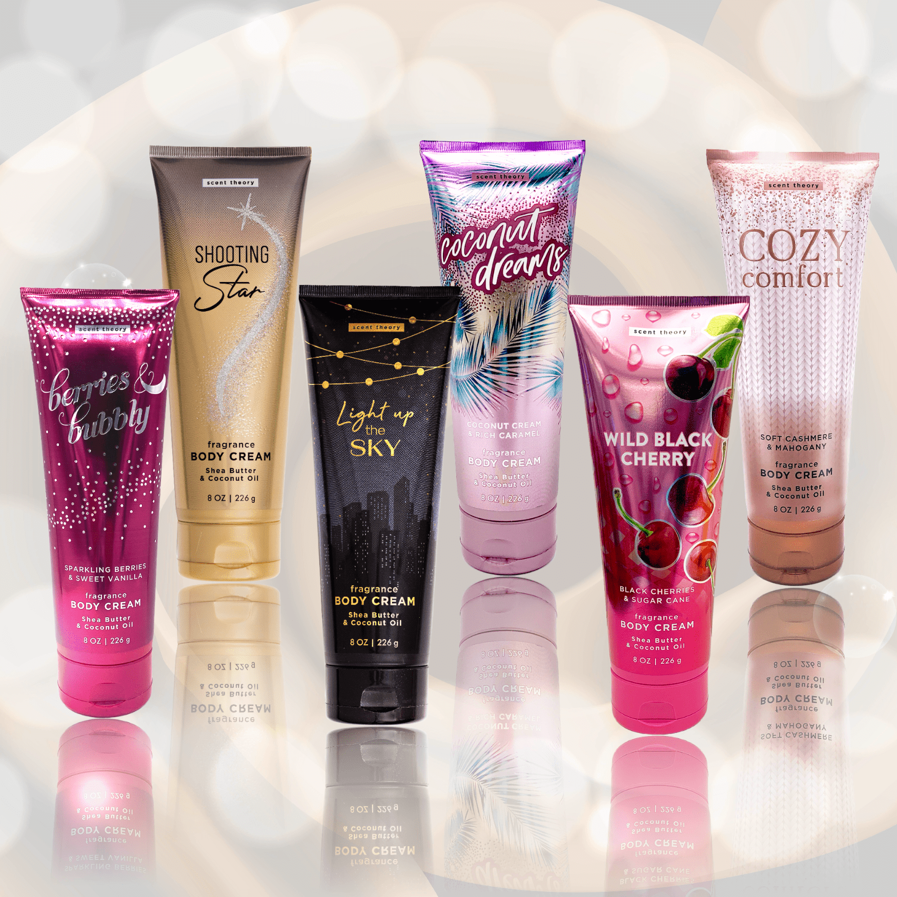 Enjoy the Scent Theory Hand and Body Cream Collection: Cozy Comfort (Soft Cashmere, Fresh Mahogany, Brisk Musk), Berries & Bubbly (Sparkling Citrus, Raspberry Puree, Sweet Vanilla), Coconut Dreams (Coconut cream, Blooming Jasmine, Brown Sugar), Light Up The Sky (Night Blooming Jasmine, Yuzu Zest, Mysterious Musk), Shooting Star (Juicy Cassis, Peony Blossoms, Baltic Amber), and Wild Black Cherry (Wild Black Cherry, Honey Apricot, Sugar Cane)