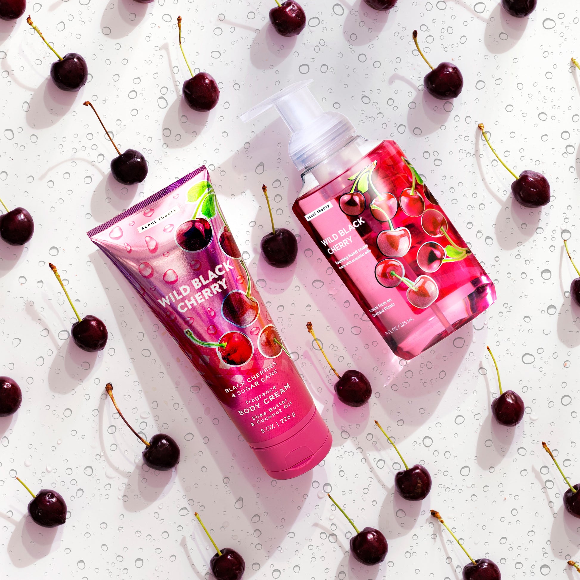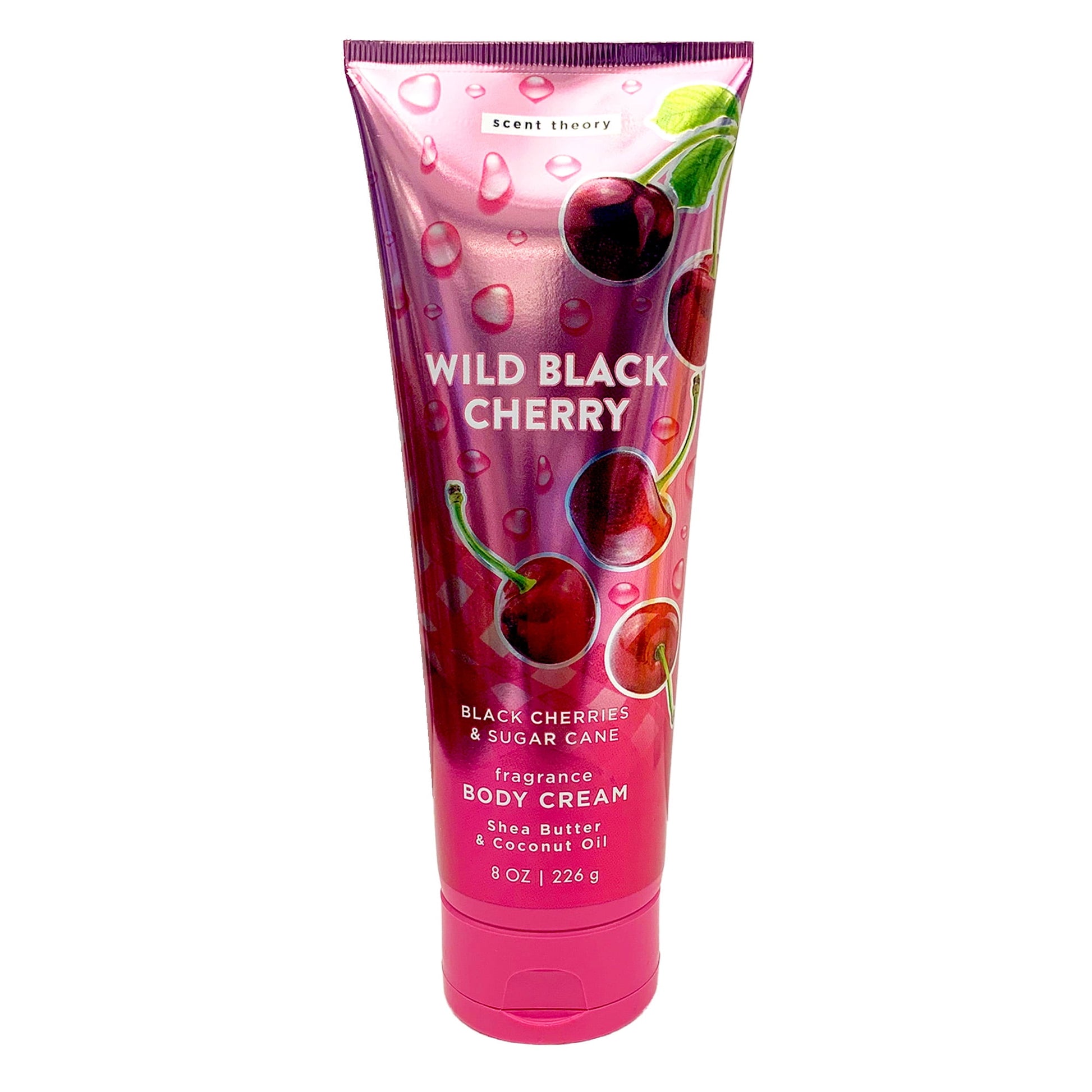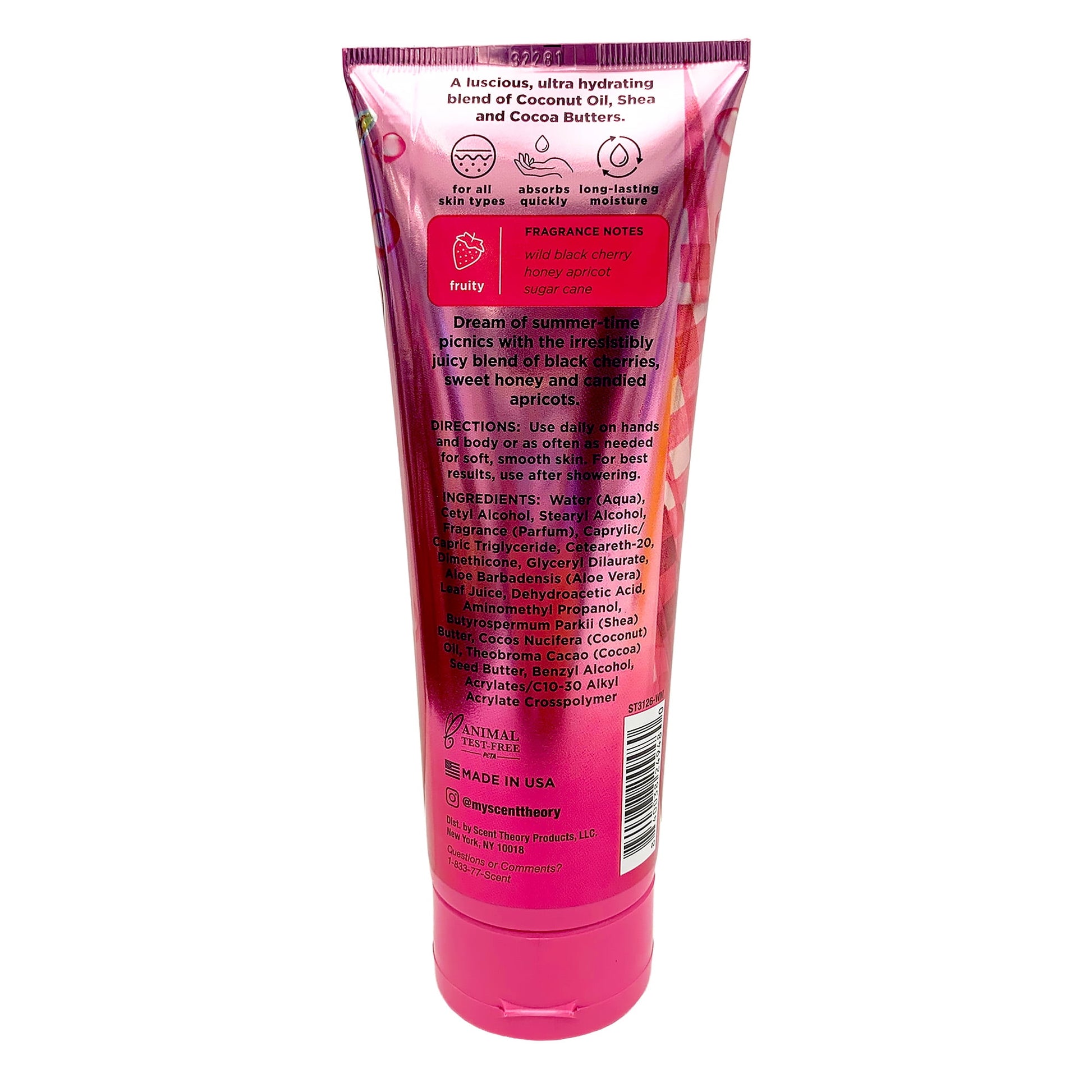 Indulge your skin with ultra smooth and deliciously scented body lotion! Scent Theory Hand and Body Cream will leave your skin feeling silky-soft and deliciously scented. Our lightweight formula includes an ultra-hydrating blend of coconut oil, shea butter, and cocoa butter that quickly absorbs into the skin for long-lasting moisture. The Wild Black Cherry is a sweet, fruity blend, combining notes of wild black cherry, honey apricot, and sugar cane, offering the dreamy fragrance of a summertime picnic. Enjoy fruity fragrance notes and velvety smooth skin with Scent Theory Wild Black Cherry Hand and Body Lotion. Our lotion is for all skin types.