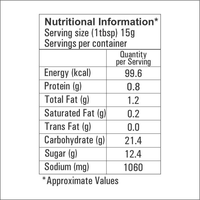 Ingredients: Water, Red Chilli, Sugar, Garlic, Sunflower Oil, Tomato Puree, Salt, Corn Starch, Acetic Acid (Acidifying Agent E260), Sesame Seeds, Xanthan Gum (Emulsifying & Stabilizing Agent E415), Disadium 5-Guanylate, Disodium 5′ Insinate (Flavour Enhancers E627, E631), s, E415), Sodium Benzoate (Preservative, E211), Spices (celery, cumin, ginger, clove, cinnamon)Eas