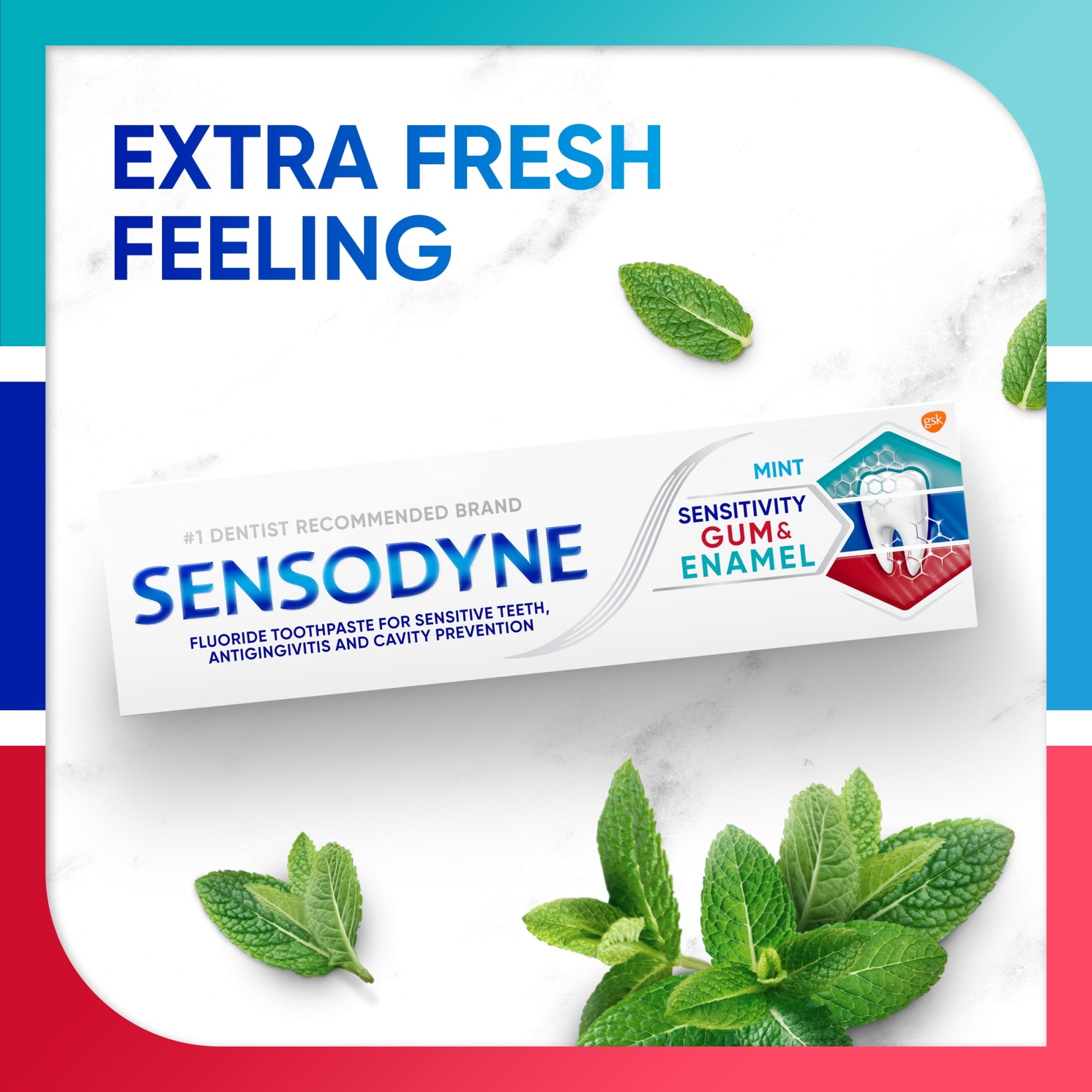 Sensodyne Sensitivity Gum and Enamel Toothpaste is a flavored toothpaste that provides long-lasting, clinically proven sensitivity relief and helps restore gum health while rehardening the enamel when used twice daily for strong and healthy teeth and gums. Gum problems are caused by a build-up of plaque bacteria, and enamel wear can be caused by acids in everyday foods and drinks. Designed with a triple-action formula, this Sensodyne toothpaste helps reharden and strengthen the enamel's surface, and protects teeth from dietary acids while being gentle on enamel. With a refreshing mint flavor, this fluoride toothpaste leaves an extra fresh, clean feeling while feeling gentle on gums. Sensodyne Sensitivity Gum and Enamel mint toothpaste comes in a recyclable carton. For trusted daily oral care, choose Sensodyne, the #1 dentist-recommended toothpaste brand for sensitive teeth.