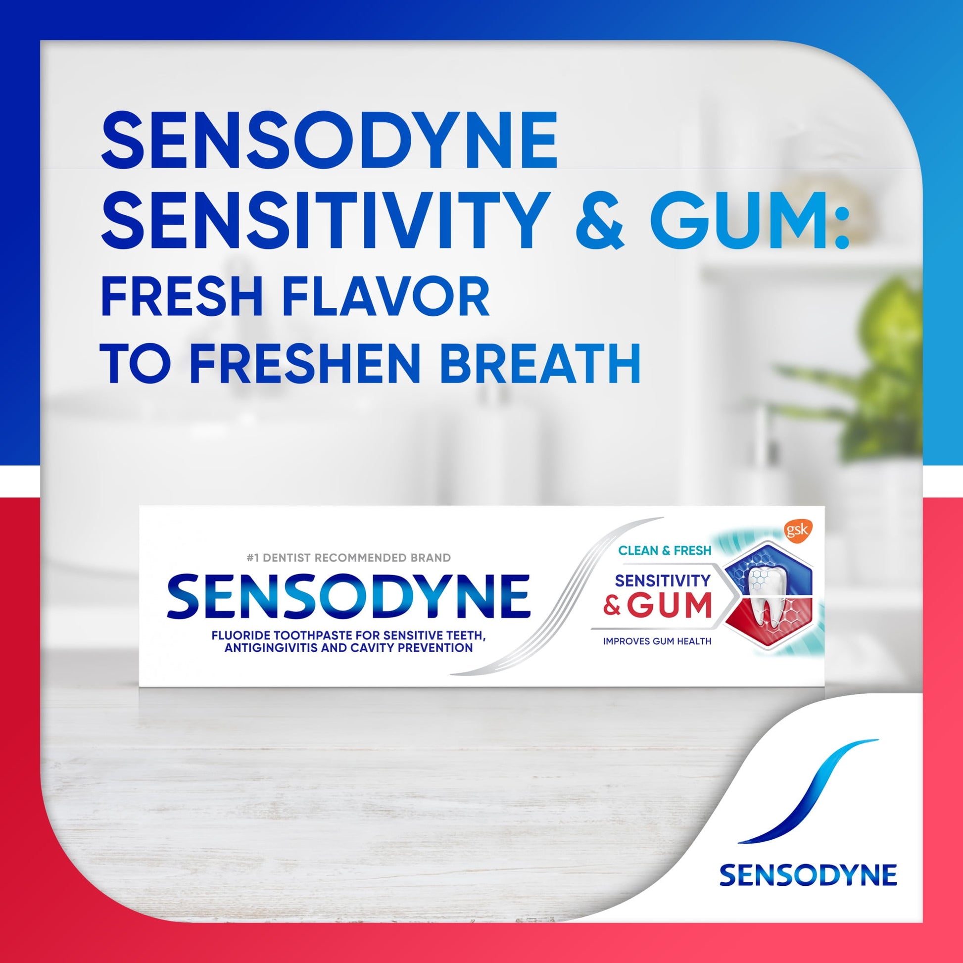Sensodyne Sensitivity & Gum Sensitive Toothpaste offers two benefits in one effective sensitivity toothpaste, relieving sensitivity pain and improving gum health at the same time. This stannous fluoride toothpaste creates a protective layer over exposed dentin, preventing pain triggers from reaching the nerves inside the tooth. With antimicrobial properties, this toothpaste for sensitive teeth also removes plaque bacteria associated with gingivitis to help reduce swollen, bleeding gums. Sensodyne Sensitivity & Gum toothpaste has a low abrasion anticavity formula to protect your teeth against tooth decay. If you suffer from tooth sensitivity and also deal with gum problems, take control of both these conditions with this Clean and Fresh toothpaste, which leaves you with fresh breath. Brush for two minutes, twice daily. Get protection from tooth sensitivity with Sensodyne.