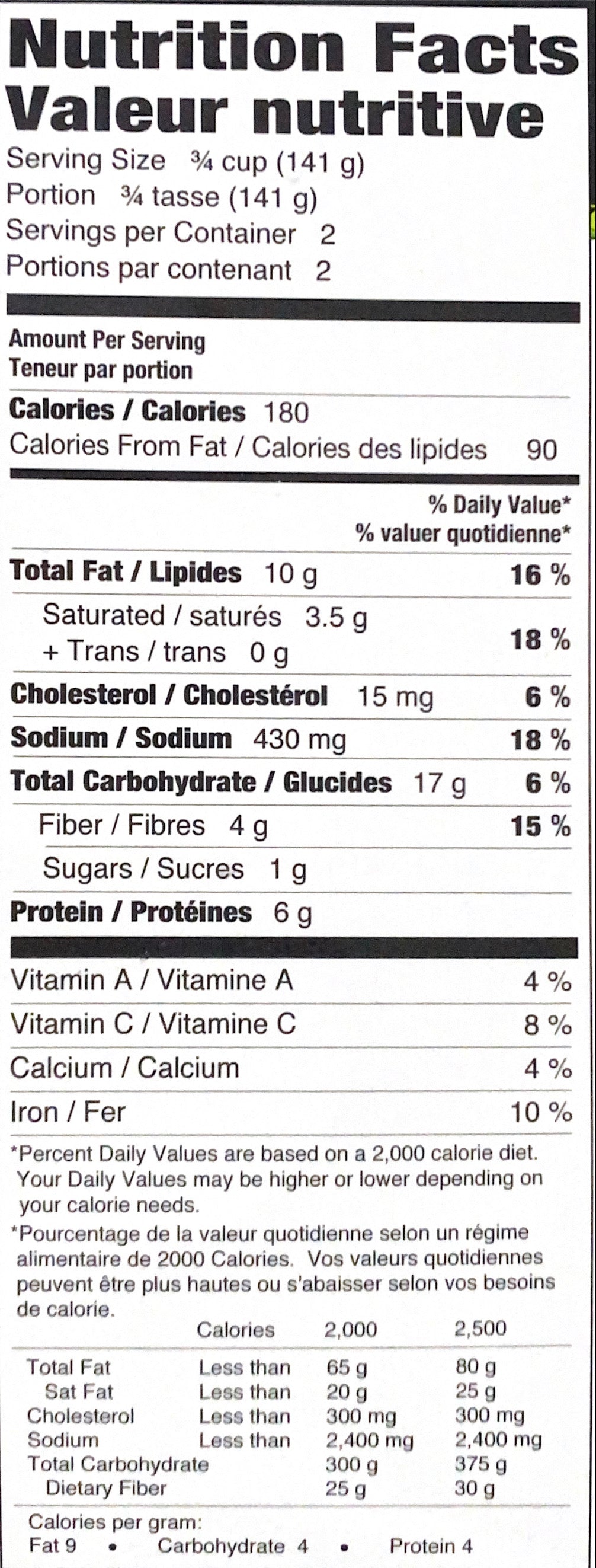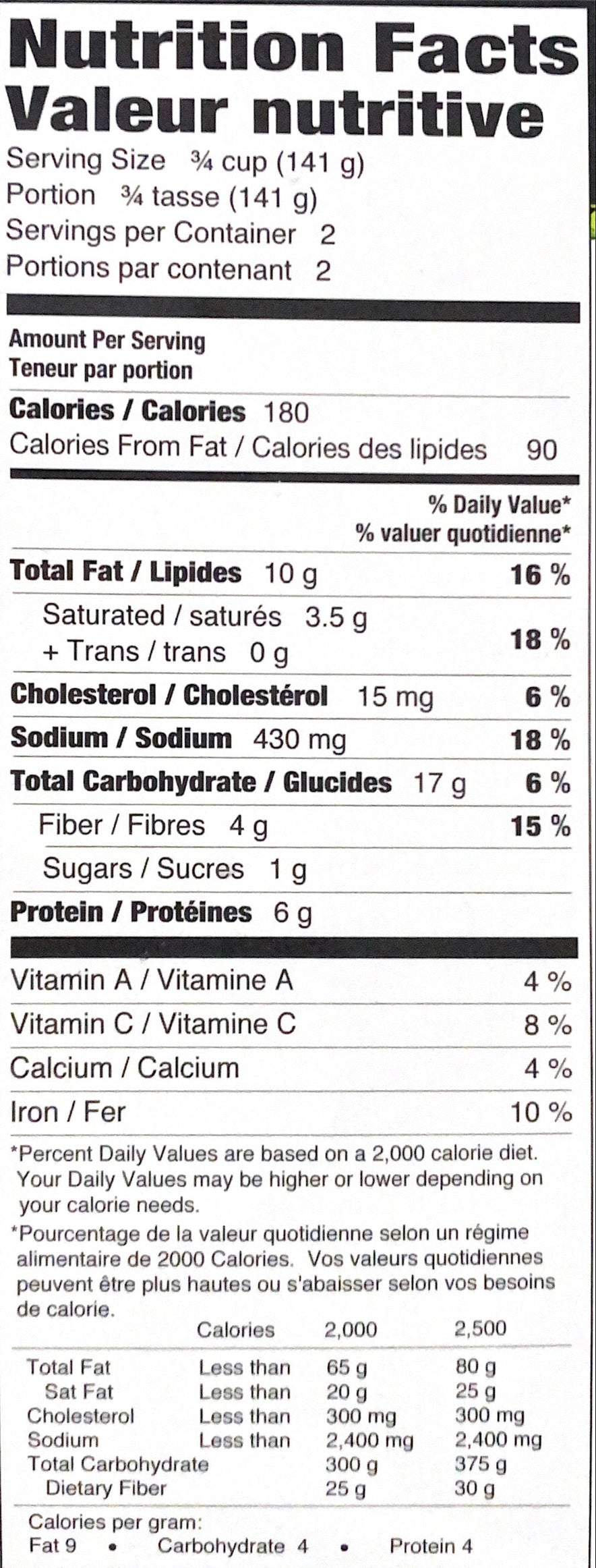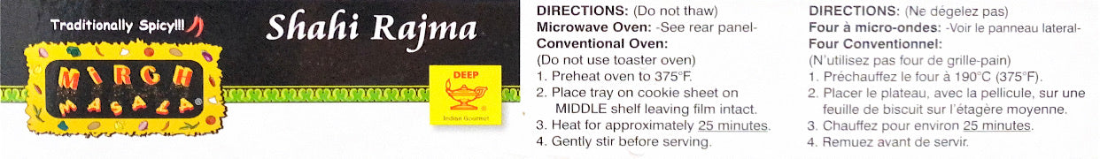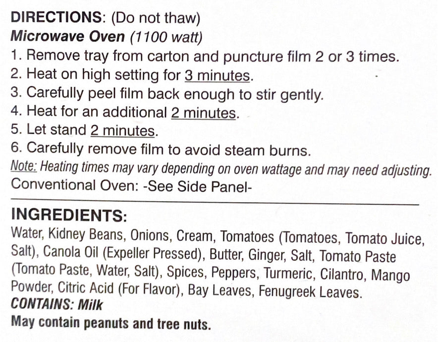 Ingredients: Water, kidney beans, onions, cream, diced tomatoes, canola oil, butter, ginger, salt, tomato paste, spices, peppers, turmeric, cilantro, mango powder, citric acid, bay leaves, fenugreek leaves.