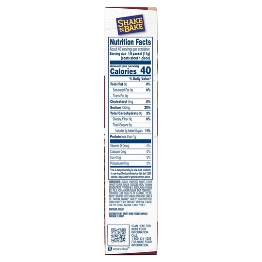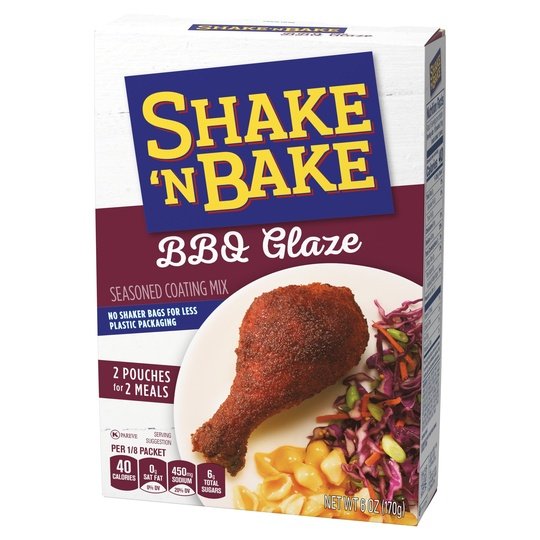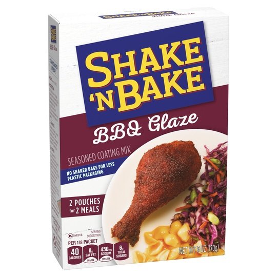 Shake up dinnertime with a family favorite. Shake 'N Bake BBQ Glaze Seasoned Coating Mix is the start of some amazing home-cooked meals. Featuring a blend of herbs, spices and bread crumbs, our seasoned coating mix creates crispy, flavorful and juicy chicken without frying. Easily add a layer of crunch to bone-in or boneless chicken, or try Shake 'N Bake with pork, vegetables and more. To prepare, simply moisten the chicken with water or egg, shake your food in a reusable container filled with Shake 'N Bake to coat it and bake until it's fully cooked. You can also try cooking your protein or veggies in an air fryer or skillet. For even more dinner ideas, check out the back of our box for three delicious recipes, including BBQ Chicken Kabobs, Quick Oven Stir-Fry and BBQ Chicken Wings. With a taste beloved by generations, Shake ’N Bake is a dinner staple that kids love to help make. Each 6 ounce box comes with two pouches to make a delicious addition to two meals your entire family will enjoy.