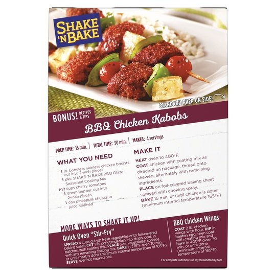 Try using Shake 'N Bake BBQ Glaze Seasoned Coating Mix to make BBQ Chicken Kabobs, Quick Oven Stir-Fry or BBQ Chicken Wings