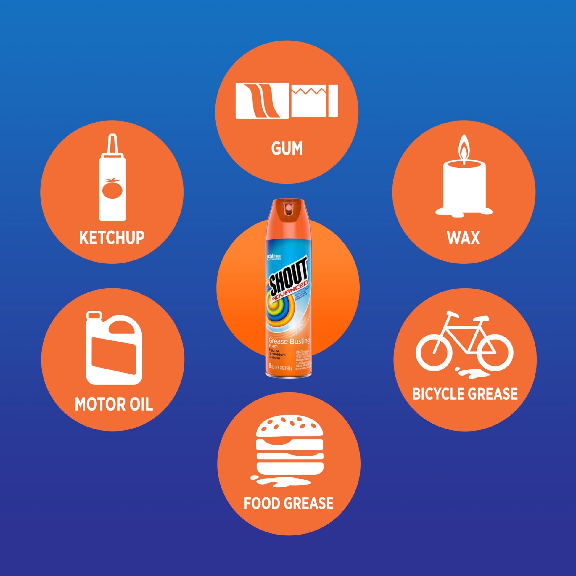Shout Advanced Grease Busting Foam Laundry Stain Remover is tough on stains, but gentle on your color-fast machine-washable fabrics. The powerful foaming action dissolves and lifts grease and oil stains that happen from the fun stuff, like food and cars. Shout Advanced Grease Busting Foam is specifically designed for tough grease stains like machine oil, greasy food and spaghetti sauce. So don?t miss out on that greasy goodness in fear of a little stain! Safe for all colorfast washables and works in all water temperatures. Shout has the stain-fighting ingredients to break up and remove tough stains so you can live in the moment, and clean up later.