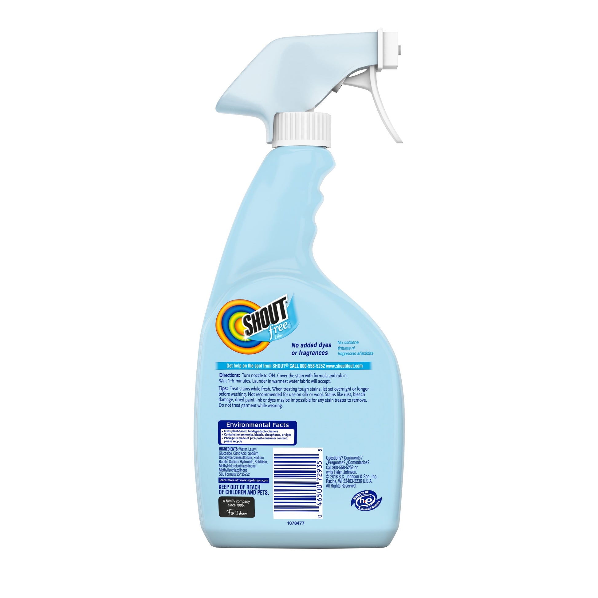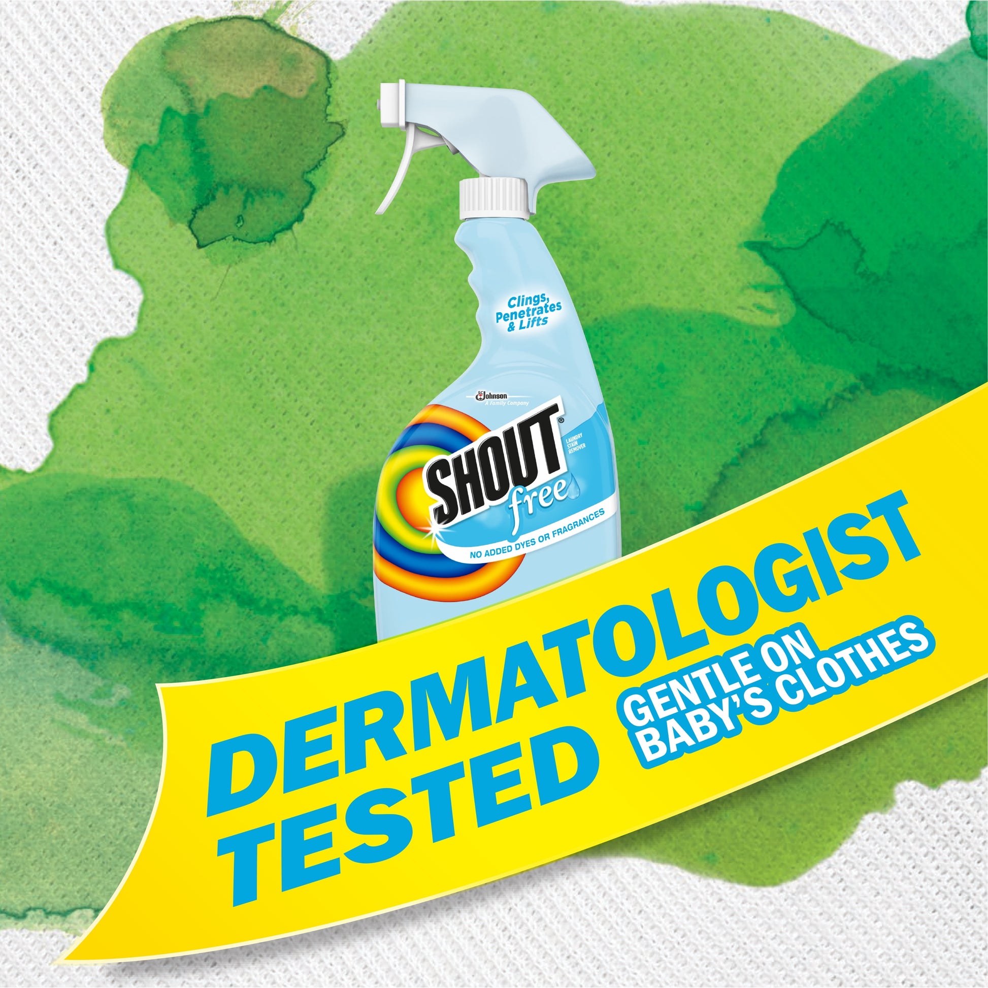 Shout Triple-Acting Laundry Stain Remover is tough on stains, but gentle on your color-fast machine-washable fabrics. It's made without any added dyes or fragrances, yet still tough enough to Cling onto fabric stains in the washing cycle, Penetrate stains quickly once sprayed upon, and Lift stains off of fabric. Shout Free is Dermatologist Tested, gentle enough for baby's clothes, and works on a wide range of everyday stains like baby formula, food, and blood. Safe for all colorfast washables and works in all water temperatures. Shout has the stain-fighting ingredients to break up and remove tough stains so you can live in the moment, and clean up later.