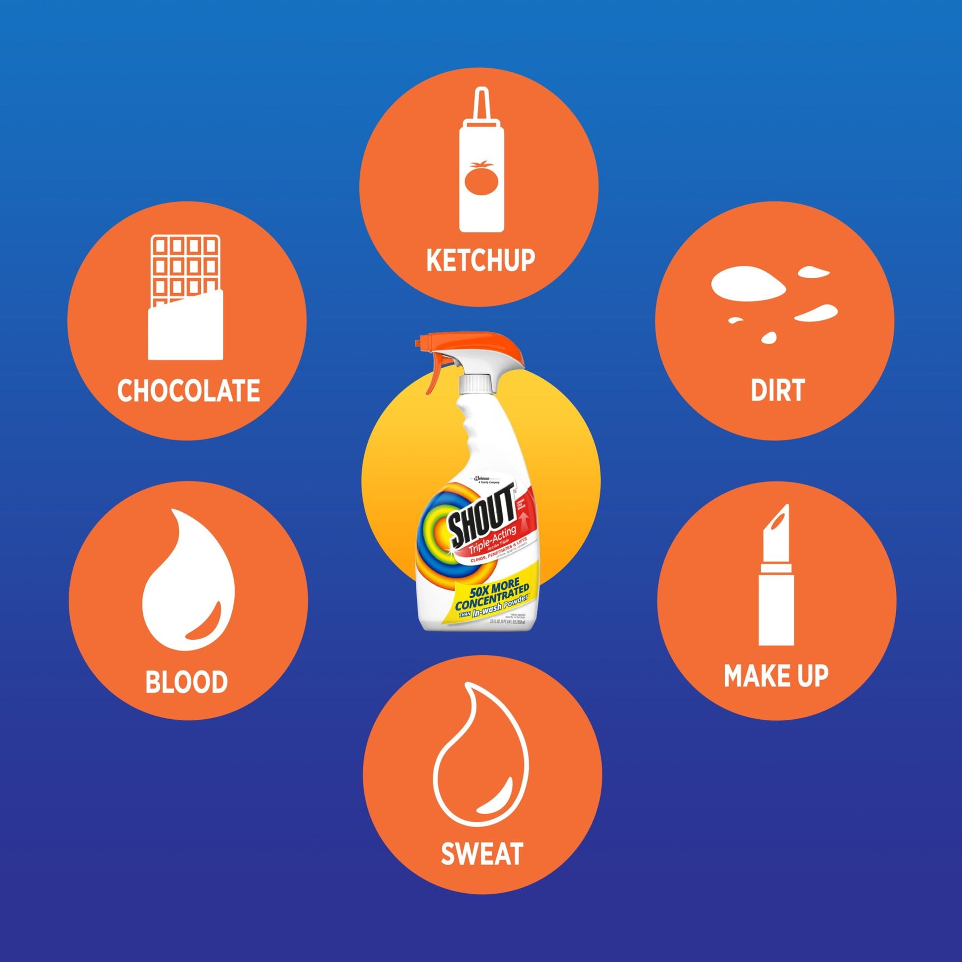Shout Triple-Acting Laundry Stain Remover is tough on stains, but gentle on your color-fast machine-washable fabrics. It's triple-acting formula Clings onto fabric stains in the washing cycle, Penetrates stains quickly once sprayed upon, and Lifts stains off of fabric. Shout Triple-Acting is 50x more concentrated than in-wash powder* and works on a wide range of everyday stains like food, grass, dirt, and blood. Safe for all colorfast washables and works in all water temperatures. Shout has the stain-fighting ingredients to break up and remove tough stains so you can live in the moment, and clean up later.