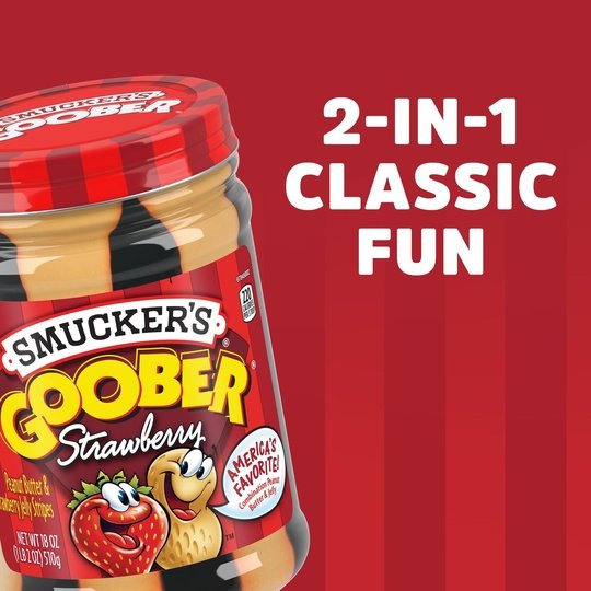 Contains 1- 18 Ounce Jar of Smucker's Goober Peanut Butter and Strawberry Jelly Stripes