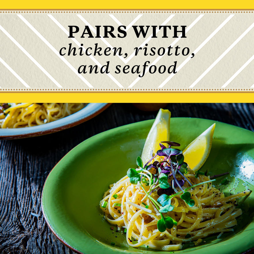 Dry wine pairs well with risotto, smokey cheeses, salads, pasta, chicken or seafood dishes