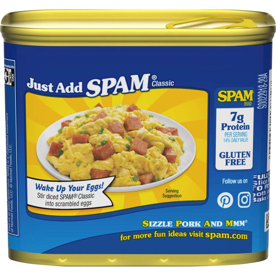SIZZLE, PORK AND MMM! SPAM Classic has a mouthwatering taste that kicks up any recipe. The “meat of many uses” adds meaty goodness to classic dishes like omelets, mac and cheese or burgers and it’ll elevate quesadillas, pasta or eggrolls to another level of Mmm. That’s why its a global iconic brand! Fully cooked and shelf stable, it's craveable and versatile so it works great for hot family meals, cold lunches or bbqs! You can add it to breakfast, lunch and dinner and know you’re getting the good stuff. It’s made with six simple ingredients and has 7 g of protein per serving. Includes one 12 oz aluminum can of SPAM Classic. All trademarks, logos and images are owned by Hormel Foods Corporation, its subsidiaries and affiliates. Copyright Hormel Foods, LLC.