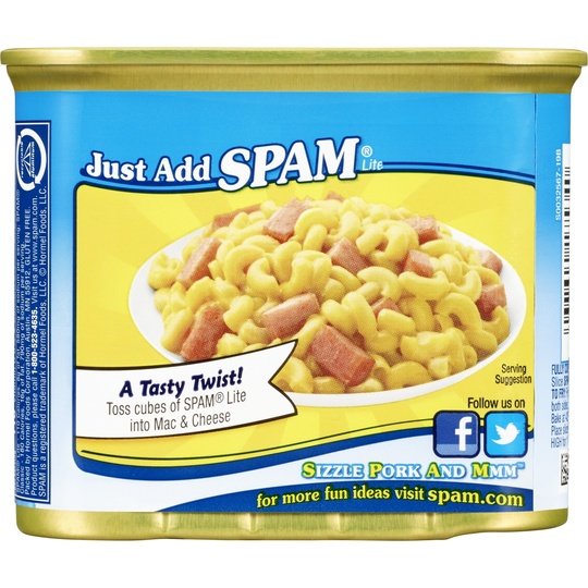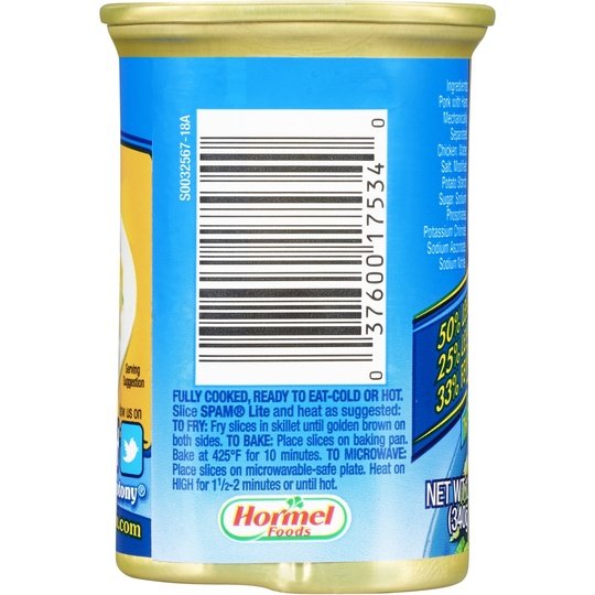 SIZZLE, PORK AND MMM! All flavor and all meat, SPAM Lite has 50% less fat, 25% less sodium and 33% fewer calories than SPAM Classic. The “meat of many uses” adds meaty goodness to classic dishes like omelets, mac and cheese or burgers and it’ll elevate quesadillas, pasta or eggrolls to another level of Mmm. In addition to classic American dishes like omelets, mac and cheese or burgers, it’ll elevate quesadillas, pasta carbonara or eggrolls to another level of Mmm. That’s why its a global iconic brand! Fully cooked and shelf stable, it's craveable and versatile so it works great for hot family meals, cold lunches or bbqs! You can add it to breakfast, lunch and dinner and know you’re getting the good stuff. It’s made with simple ingredients and has 9 g of protein per serving. One 12 oz. aluminum can of SPAM Lite. All trademarks, logos and images are owned by Hormel Foods Corporation, its subsidiaries and affiliates. Copyright Hormel Foods, LLC.