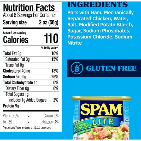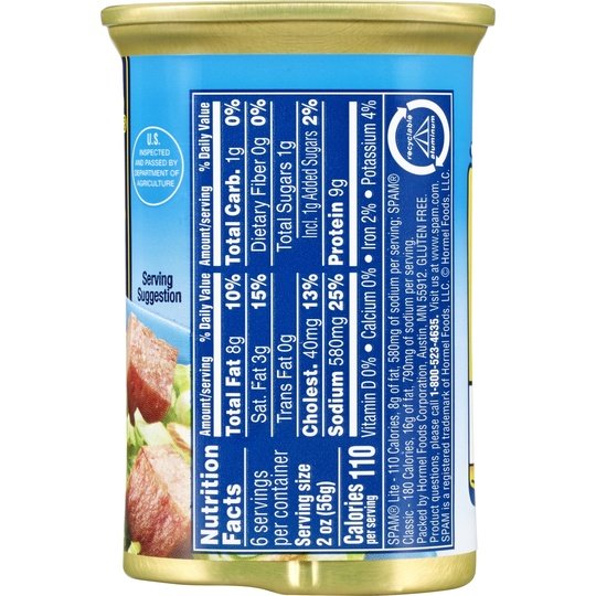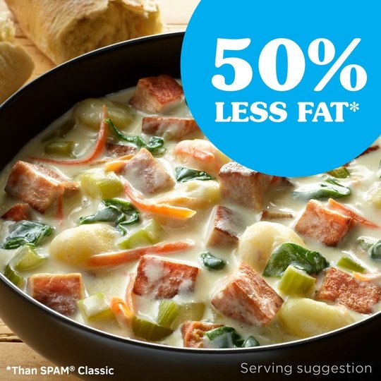 50% less fat, 25% less sodium and 33% fewer calories,* so enjoy the “meat of many uses” adds meaty goodness to any recipe (*Than SPAM Classic)