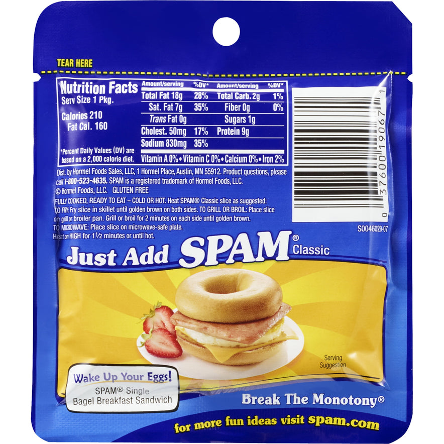 SIZZLE, PORK AND MMM! So much flavor in a little pouch - SPAM Singles have a mouthwatering taste that will kick up any recipe. The “meat of many uses” adds meaty goodness to classic dishes like omelets, mac and cheese or burgers and it’ll elevate quesadillas, pasta or eggrolls to another level of Mmm. That’s why its a global iconic brand! Fully cooked and shelf stable, SPAM Singles works great for hot meals, cold lunches or bbqs! You can add it to breakfast, lunch and dinner. It’s made with simple ingredients and has 9 g of protein per serving. One 2.5 oz. aluminum pouch of SPAM Single Classic. All trademarks, logos and images are owned by Hormel Foods Corporation, its subsidiaries and affiliates. Copyright Hormel Foods, LLC.