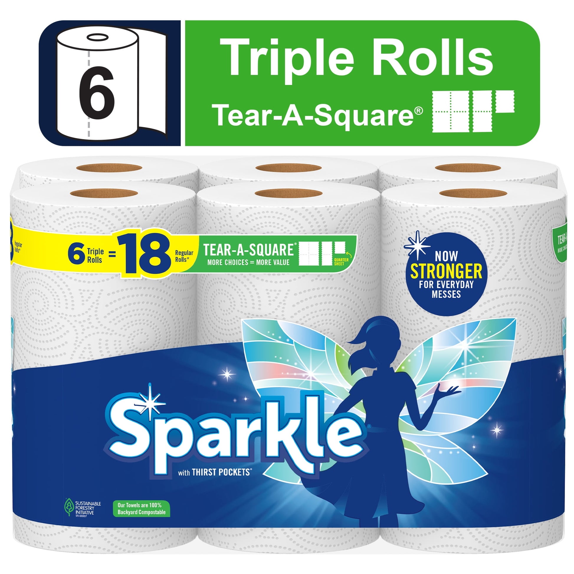 Each pack contains 6 Triple Rolls of White Sparkle Tear-A-Square paper towels