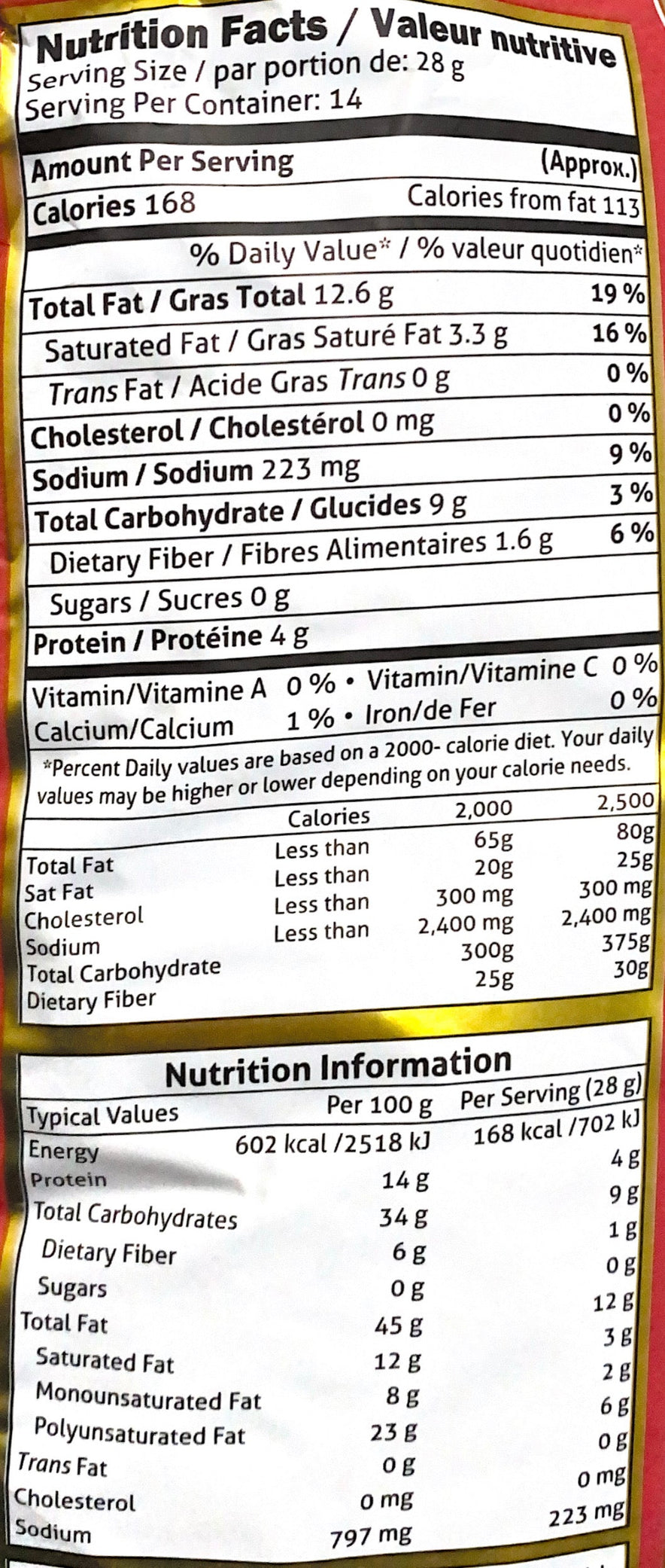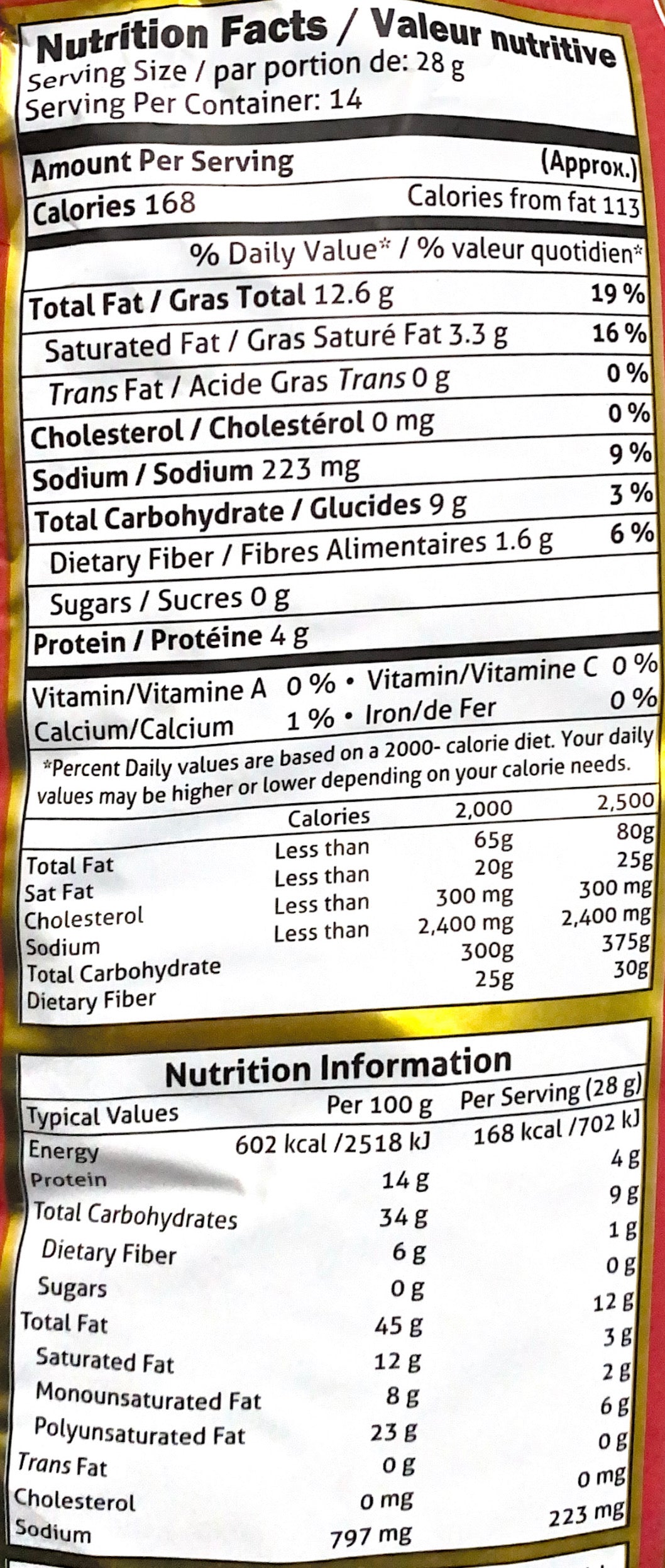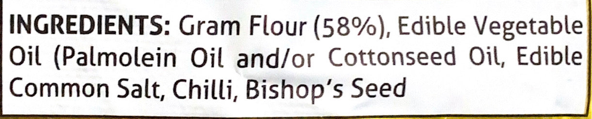 Dew Bean Flour (Moth Flour) (47.5%), Edible Vegetable Oil (Palmolein Oil and/or Cottonseed Oil), Gram Flour (9%), Ground Spices and Condiments (Iodised Salt, Red Chilli, Black Pepper, Turmeric (Colouring & Spices) Bishop’s Seed, Asafoetida)