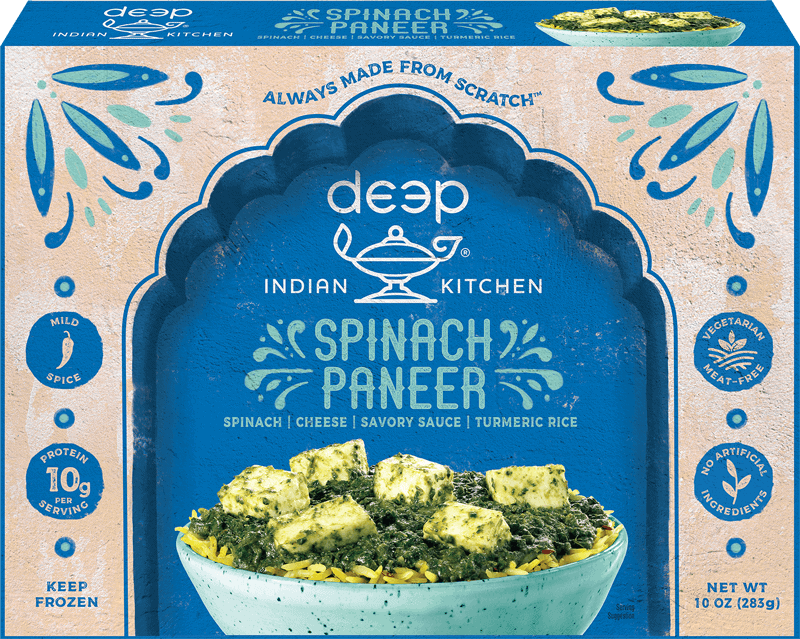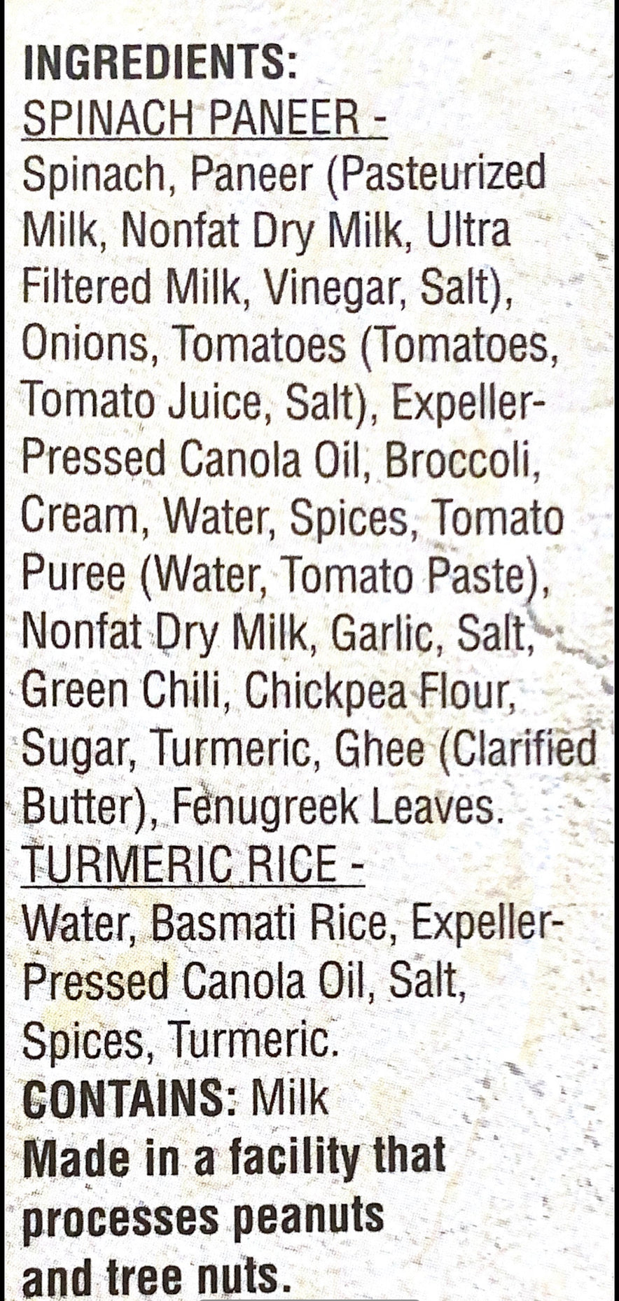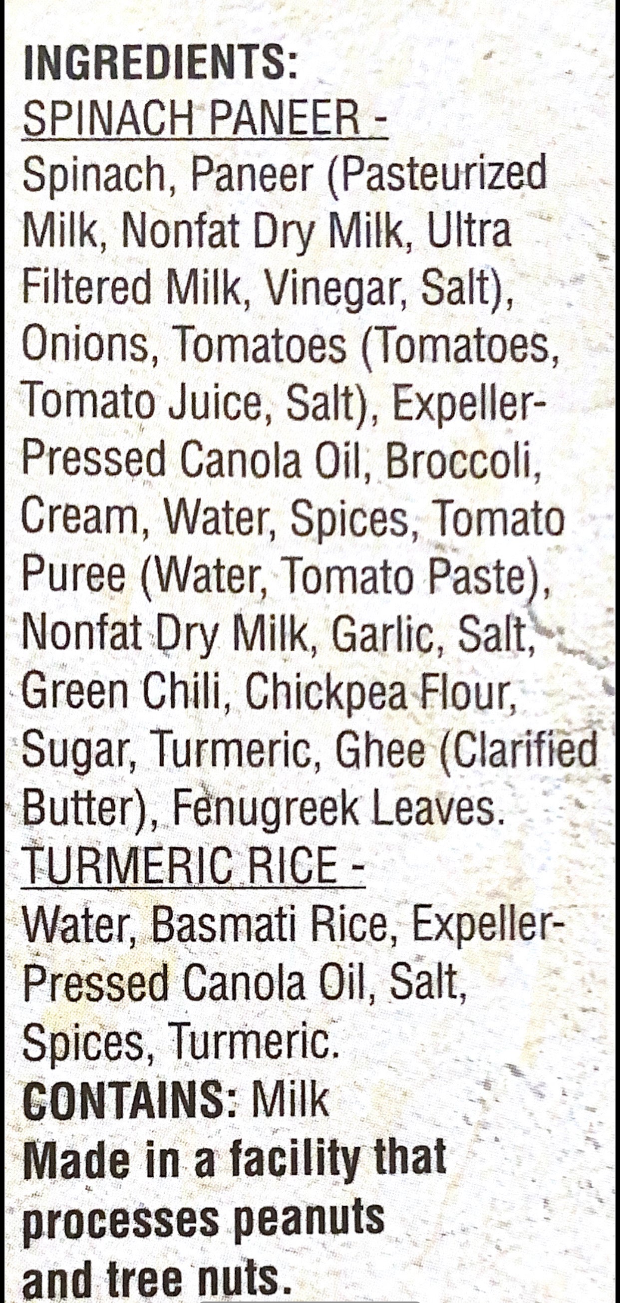 Here in our kitchen we make Spinach Paneer from scratch by finely chopping fresh spinach (palak) and cooking it down with a zesty blend of ginger, garlic and other delicious spices. We add savory pieces of our homestyle paneer (cheese) and turmeric rice. We find it is best served with a cheesy joke. Get it?