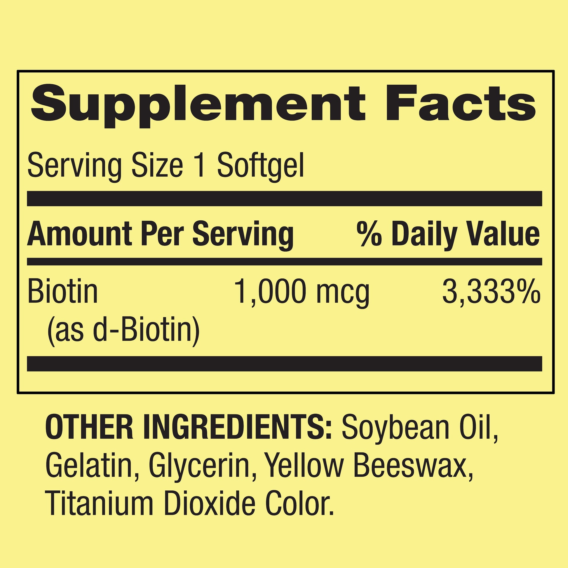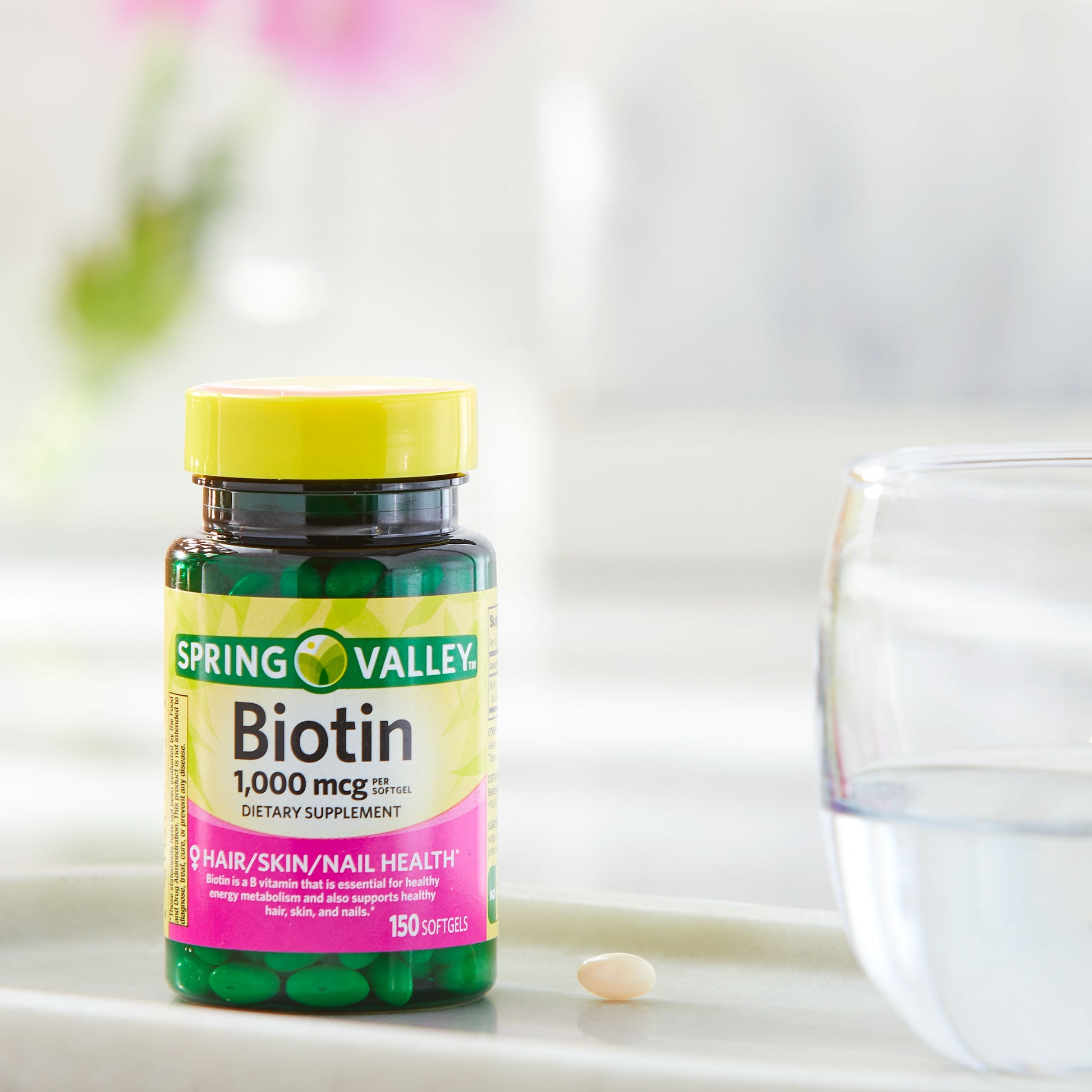 Spring Valley Biotin Softgels are a dietary supplement formulated to promote hair, skin, and nail health. Like all the B vitamins, Biotin contributes to nervous system health and is essential for energy metabolism - it helps convert the food you eat into energy in the body. These natural supplements are free from gluten, yeast, wheat, milk, milk derivatives, lactose, sugar, preservatives and artificial flavors to provide you with only the most wholesome biotin. You can rest assured that Spring Valley Biotin Softgels are produced with strict quality guidelines and are backed by a quality guarantee, making them a smart choice for your dietary supplement needs. With 1000mcg of Biotin in every softgel, you can count on our Spring Valley Biotin Softgels to become your daily source for hair skin and nail health.