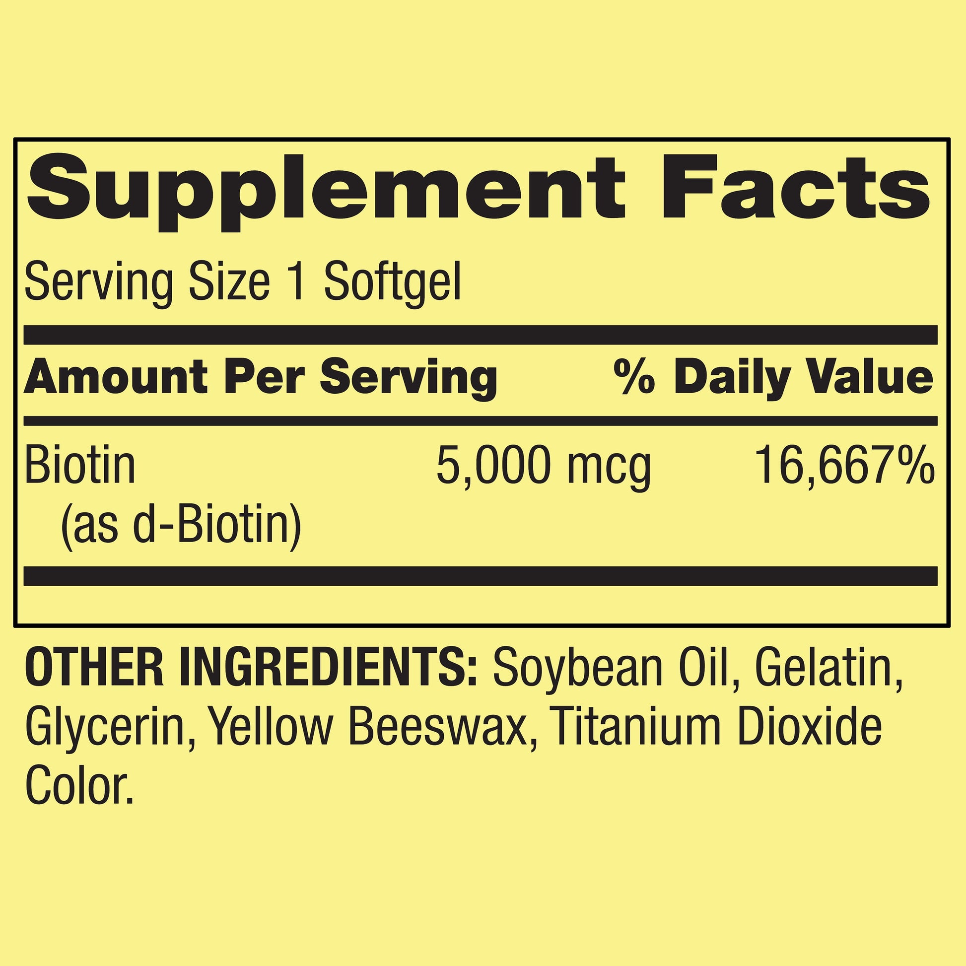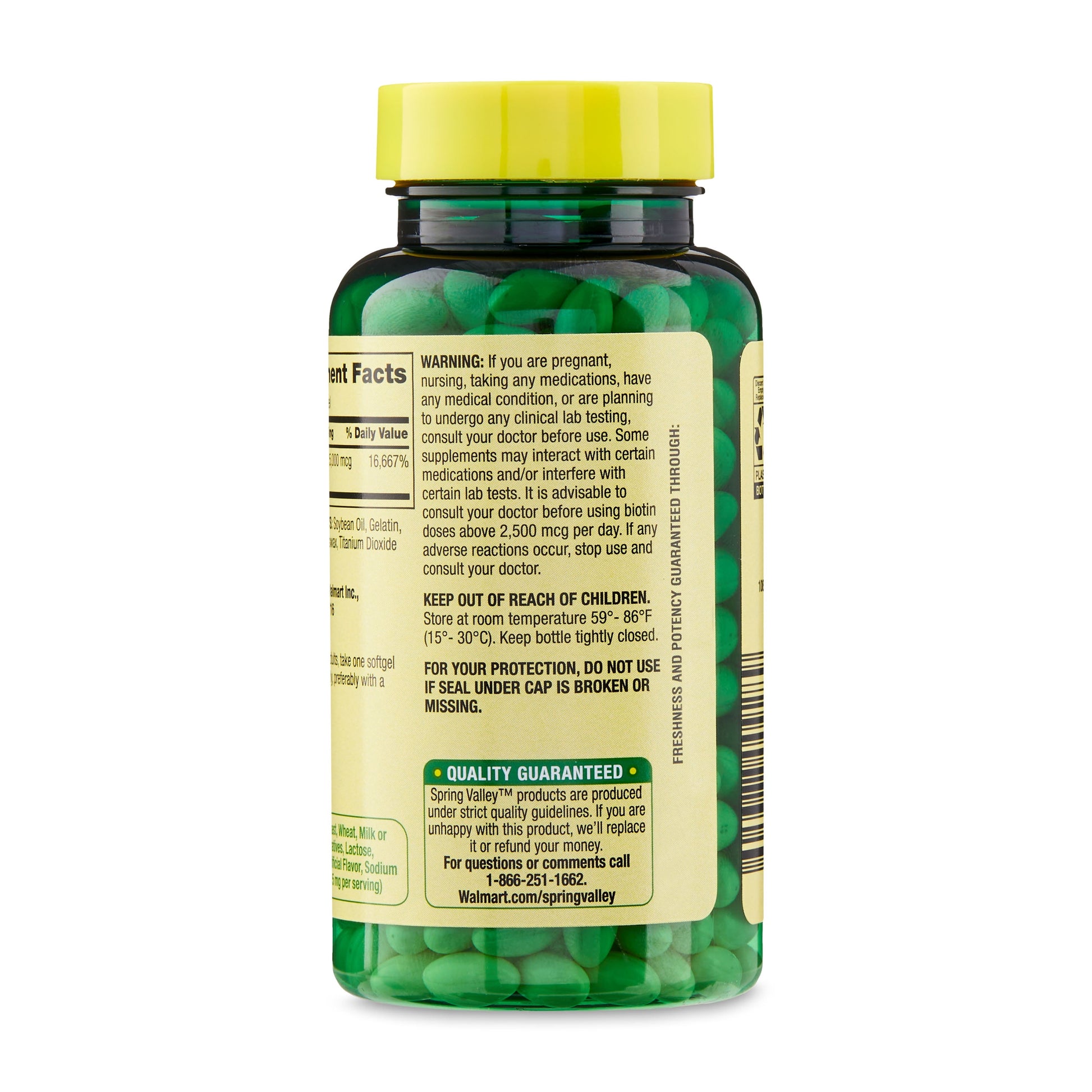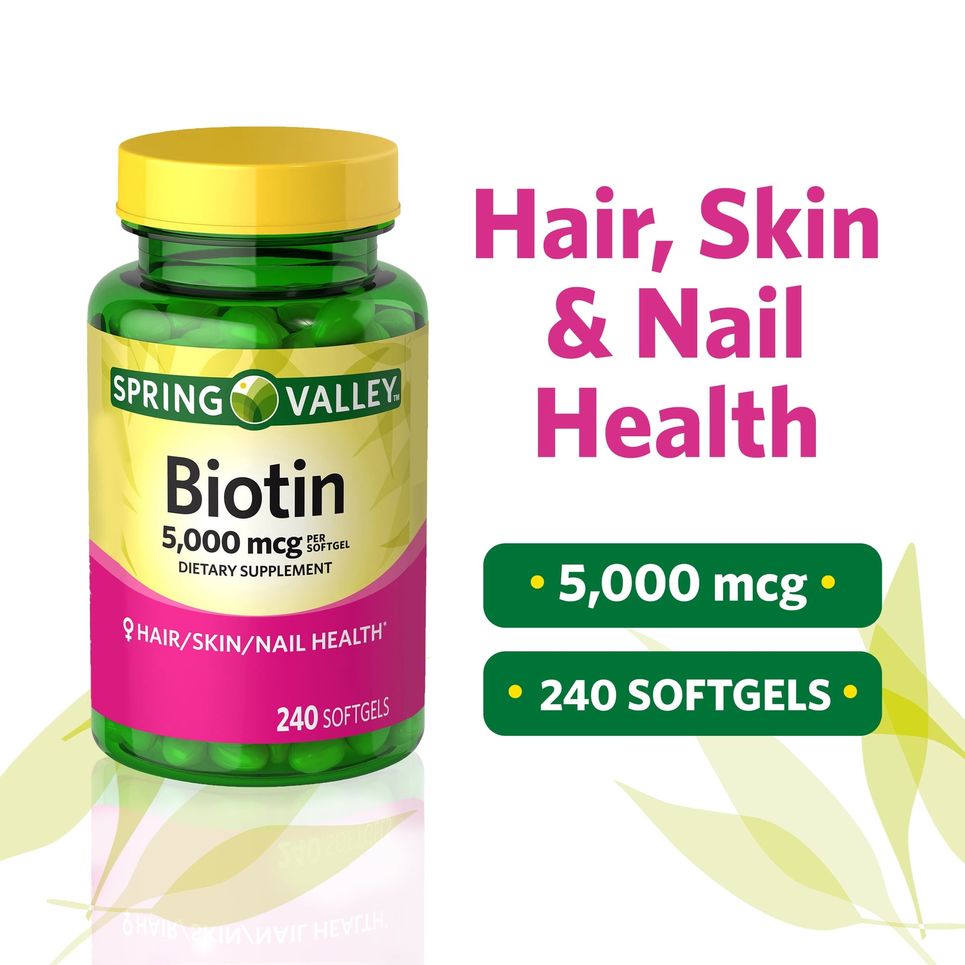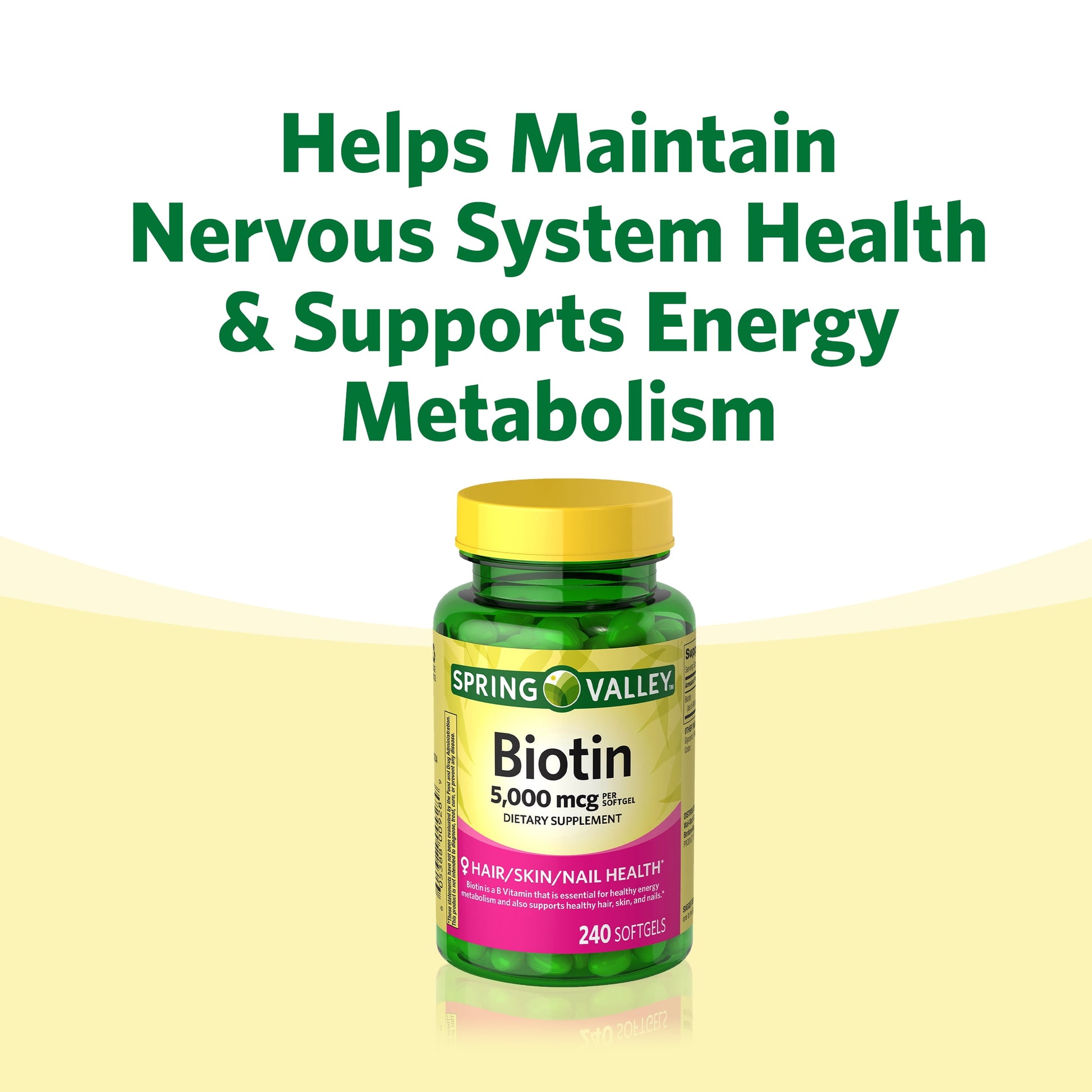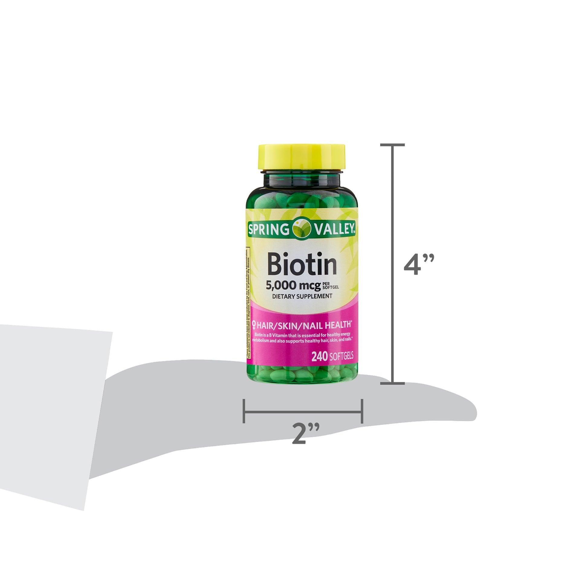 Spring Valley Biotin Dietary Supplement is a B vitamin supplement that is essential for healthy energy metabolism and also supports healthy hair, skin, and nails.* The suggested adult dosage is one softgel, one to two times daily, preferably with a meal. These softgels are free from gluten, yeast, wheat, milk or milk derivatives, lactose, and sugar, and contain no artificial flavors, or preservatives. You can rest assured that Spring Valley Biotin Dietary Supplement, 5,000 mcg, is produced with strict quality guidelines and backed by our quality guarantee.
