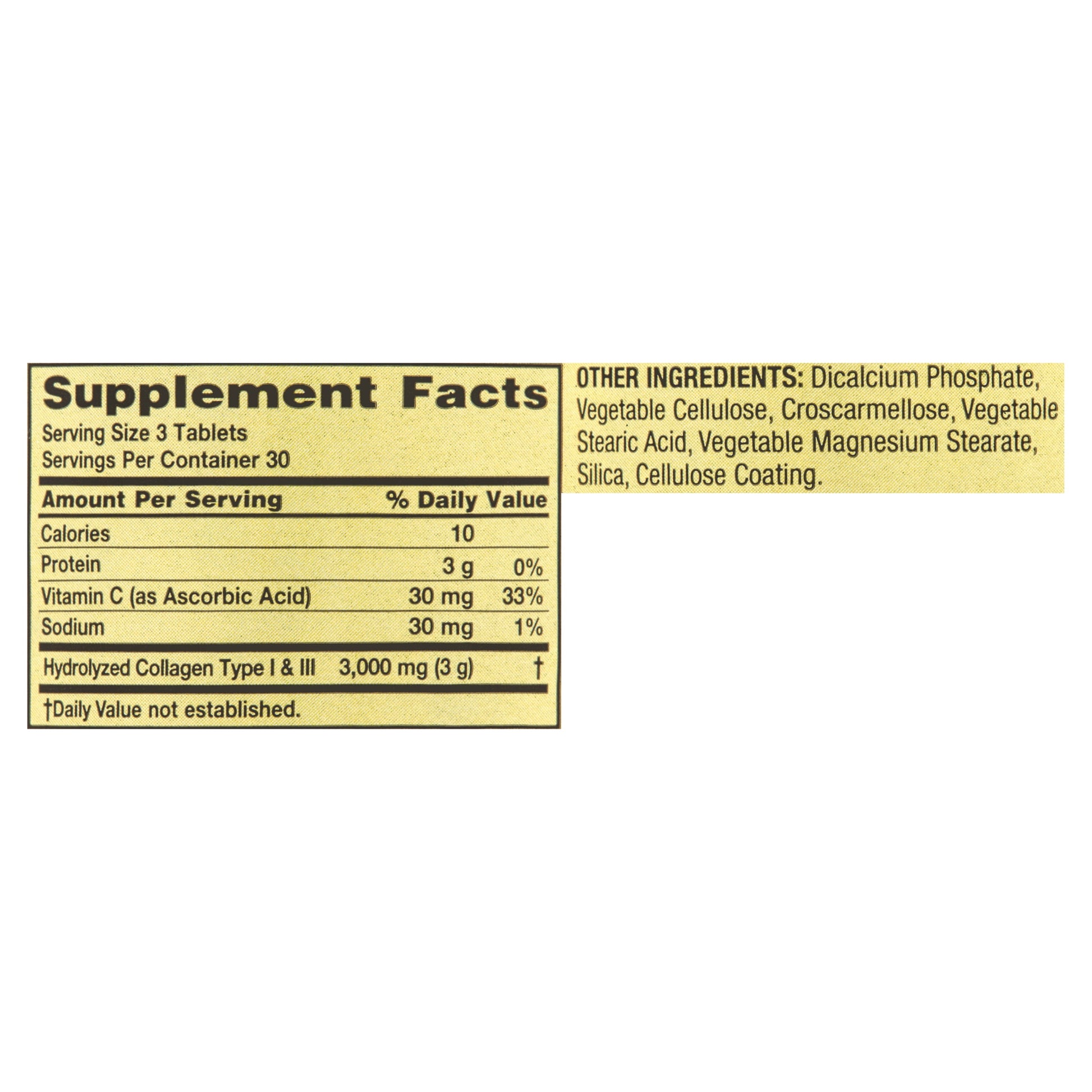 Spring Valley Collagen Type 1 & 3 plus Vitamin C Hair/Skin/Nails Health Dietary Supplement Tablets are a dietary supplement that promotes hair, skin, and nail health.* Collagen is a major structural protein that provides the building blocks to help support healthy hair, skin, and nails.* The suggested adult dosage is three tablets, twice daily, preferably on an empty stomach. These tablets are free of gluten, yeast, wheat, milk, lactose, and soy, and contain no artificial colors, artificial flavors, or preservatives. You can rest assured that Spring Valley Collagen Type 1 & 3 plus Vitamin C Hair/Skin/Nails Health Dietary Supplement Tablets are produced with strict quality guidelines and are backed by our quality guarantee.