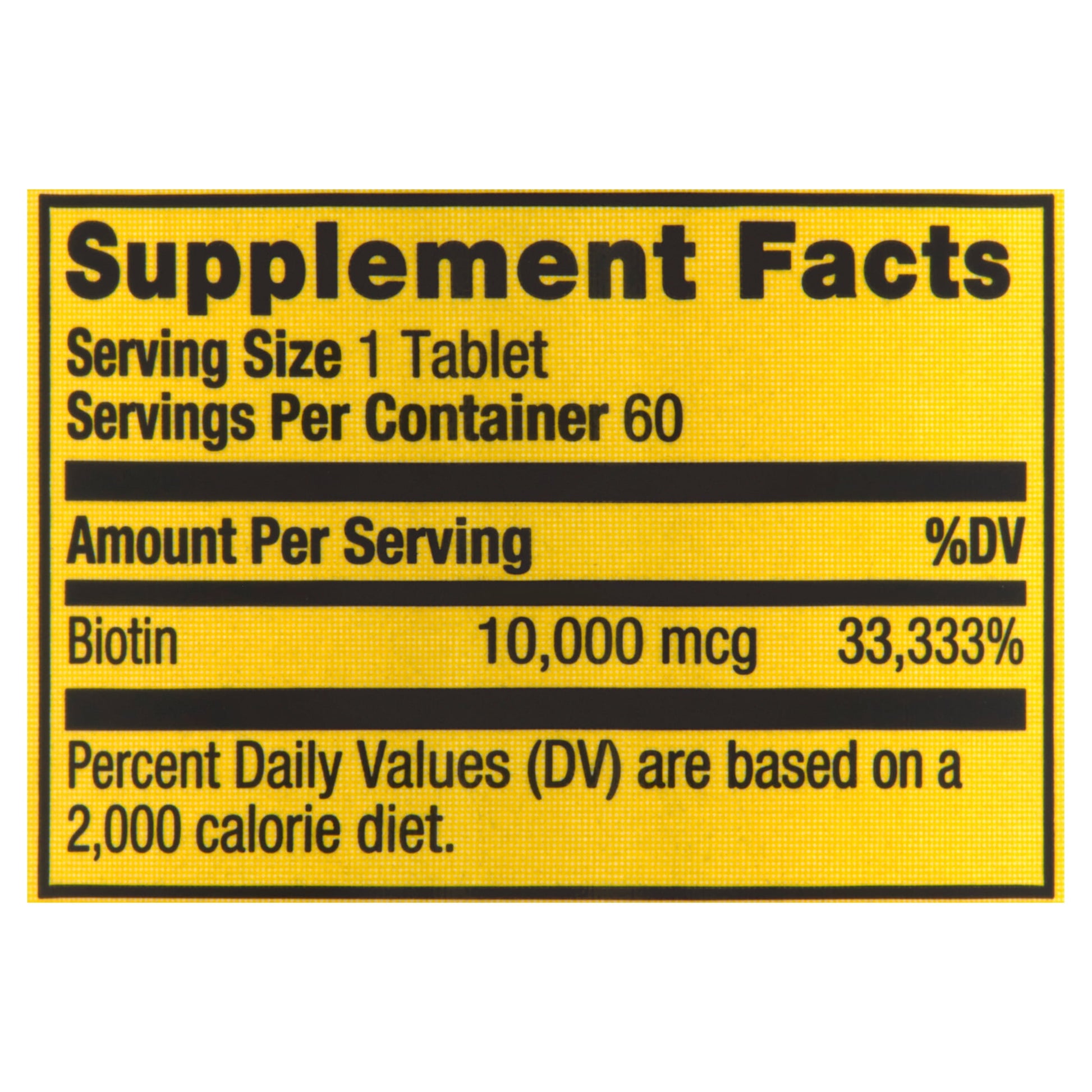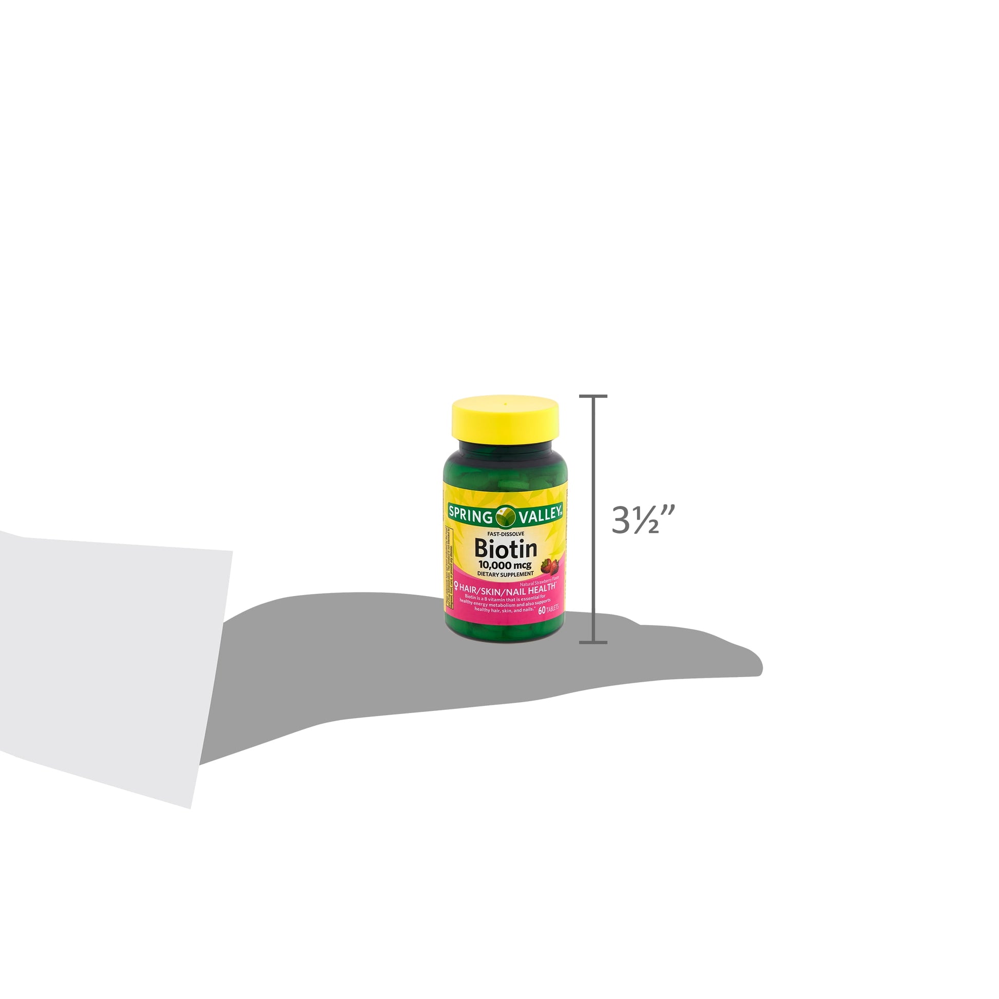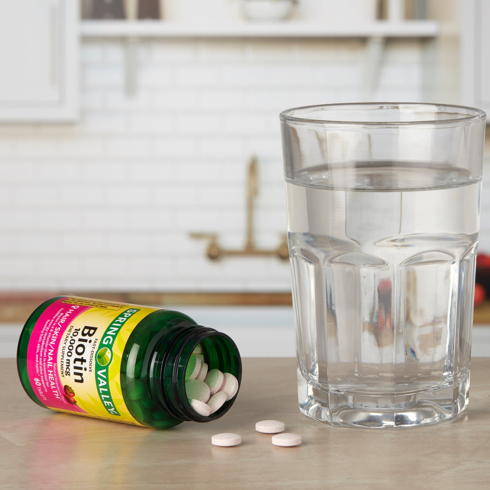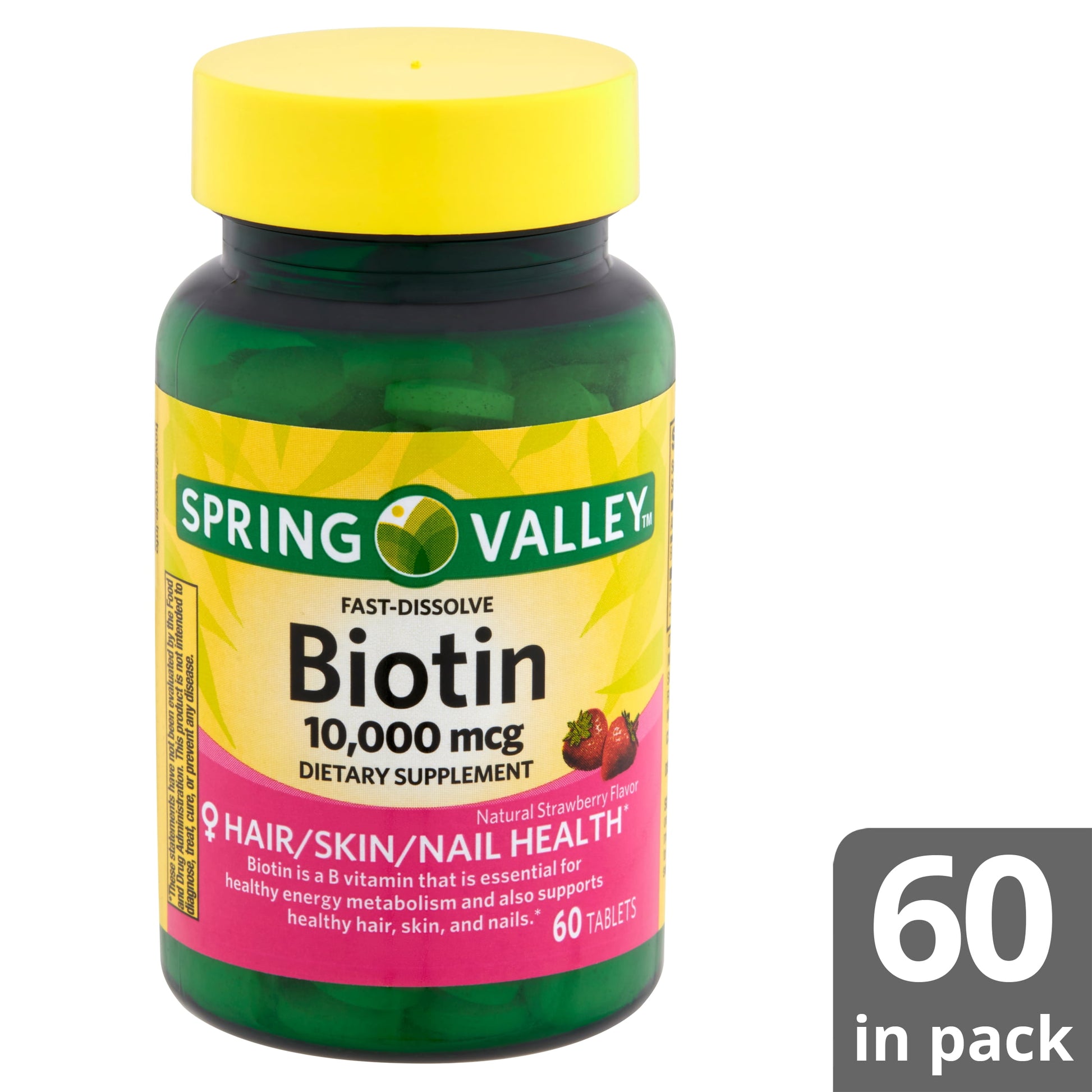 Spring Valley Fast-Dissolve Biotin Dietary Supplement is a dietary supplement for hair, skin, and nail health. Biotin is a B vitamin that is essential for healthy energy metabolism and also supports healthy hair, skin, and nails. The suggested adult dosage is one fast-dissolve tablet daily, preferably with a meal. These supplements contain no milk, eggs, fish, crustacean shellfish, tree nuts, peanuts, soybeans, yeast, artificial colors or flavors, or preservatives. You can rest assured that Spring Valley Fast-Dissolve Biotin Dietary Supplement is produced with strict quality guidelines and is backed by a quality guarantee, making them a smart choice for your dietary supplement needs.