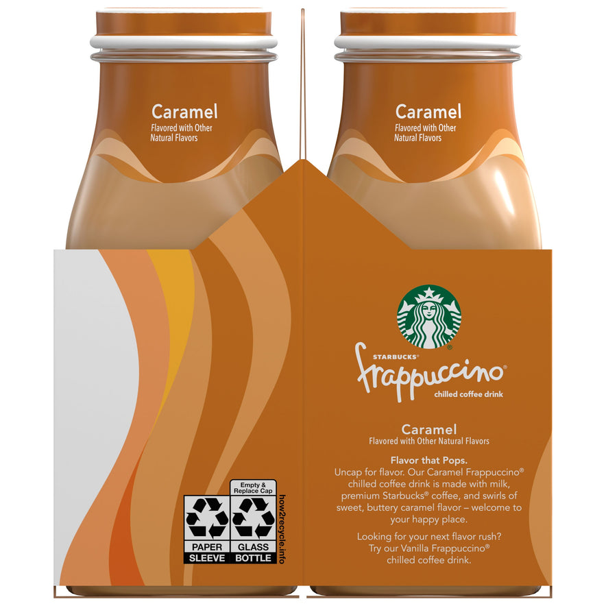 Starbucks Frappuccino Chilled Coffee Drink Caramel,A good source of protein and calcium.Caramel Frappuccino® chilled coffee drink is a blend of Starbucks® coffee and milk swirling with caramelly flavor.For a sweet burst of delicious.Want more creamy, coffee yum?Try other flavors, like mocha light and vanilla light with 100 calories per bottle.Made from 100% recycled fiber with at least 35% post-consumer material.Partially produced with genetic engineering.Check us out at frappuccino.com.©2016 North American Coffee Partnership.