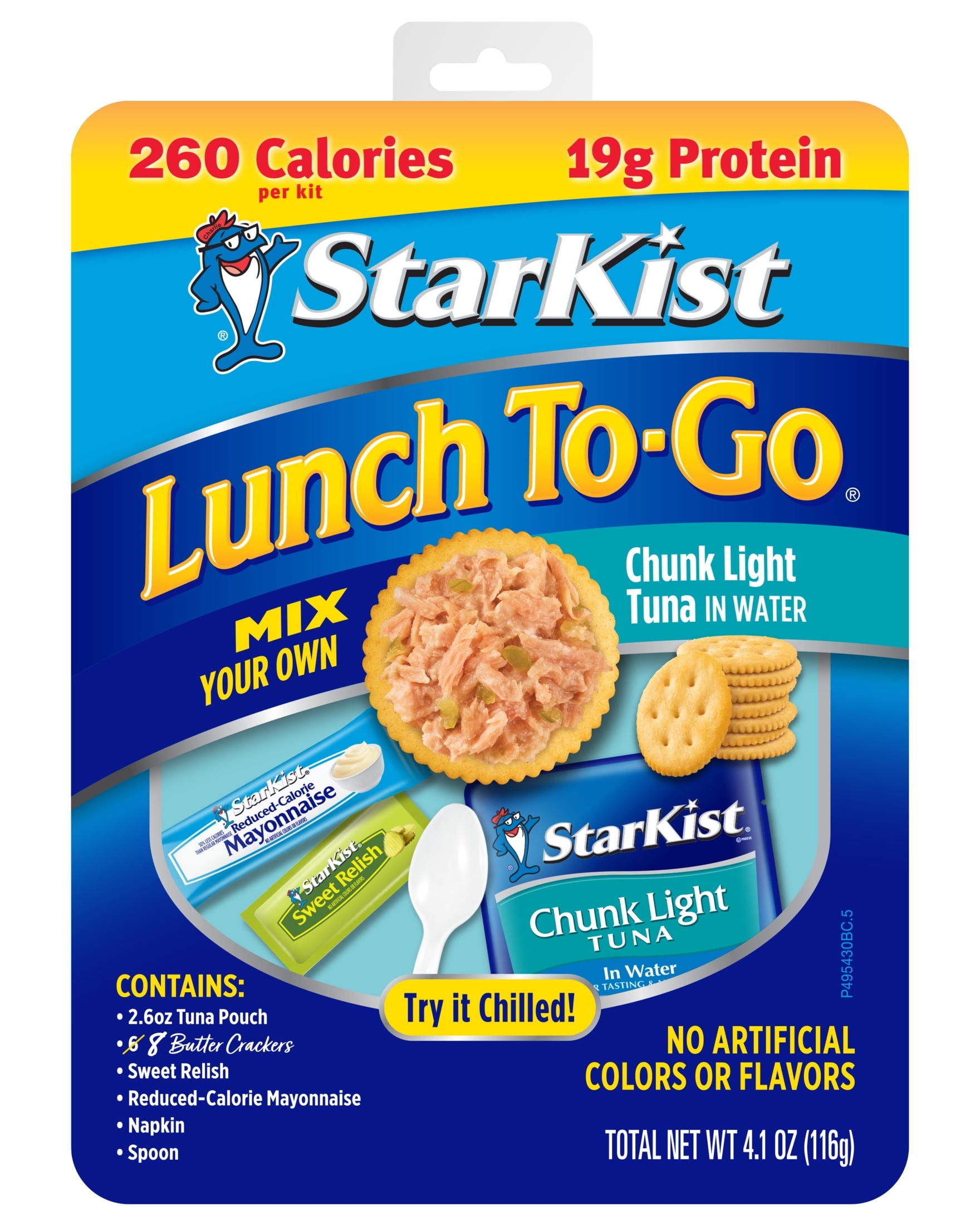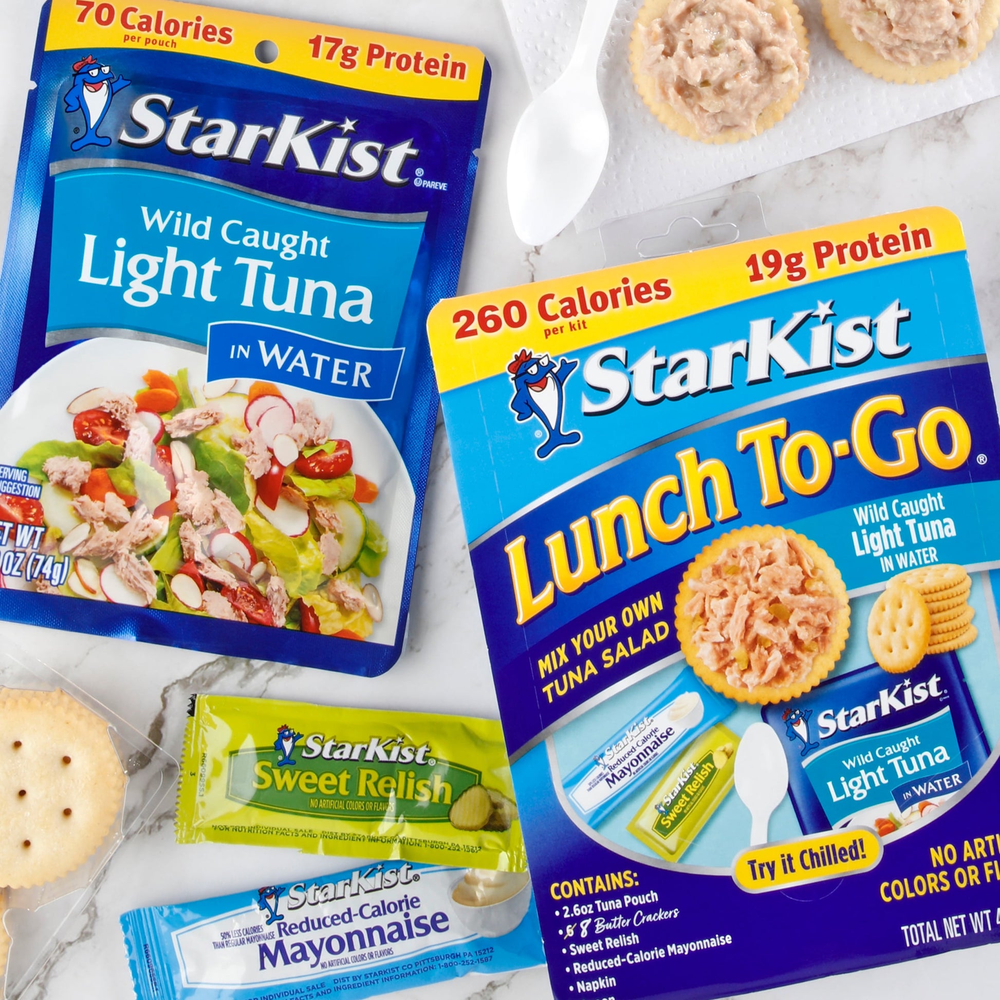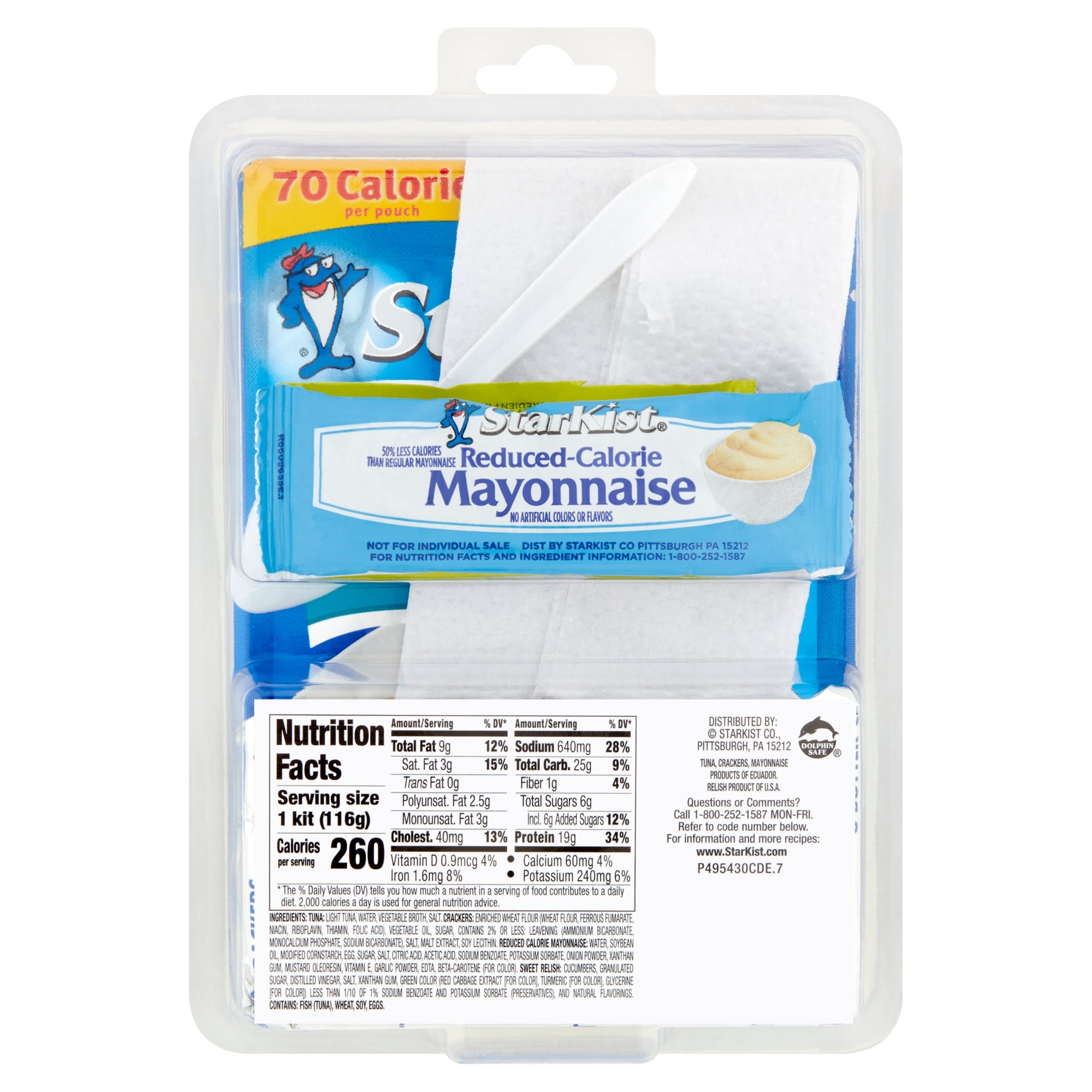 Comes Complete with: (1) StarKist 2.6 oz Chunk Light Tuna in Water Pouch, Reduced Calorie-Mayonnaise and Relish Packets, Mixing Spoon & (8) Butter Crackers with a Napkin