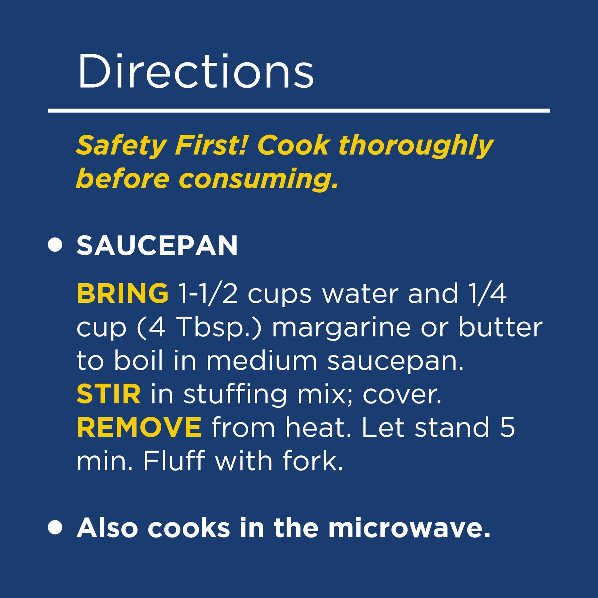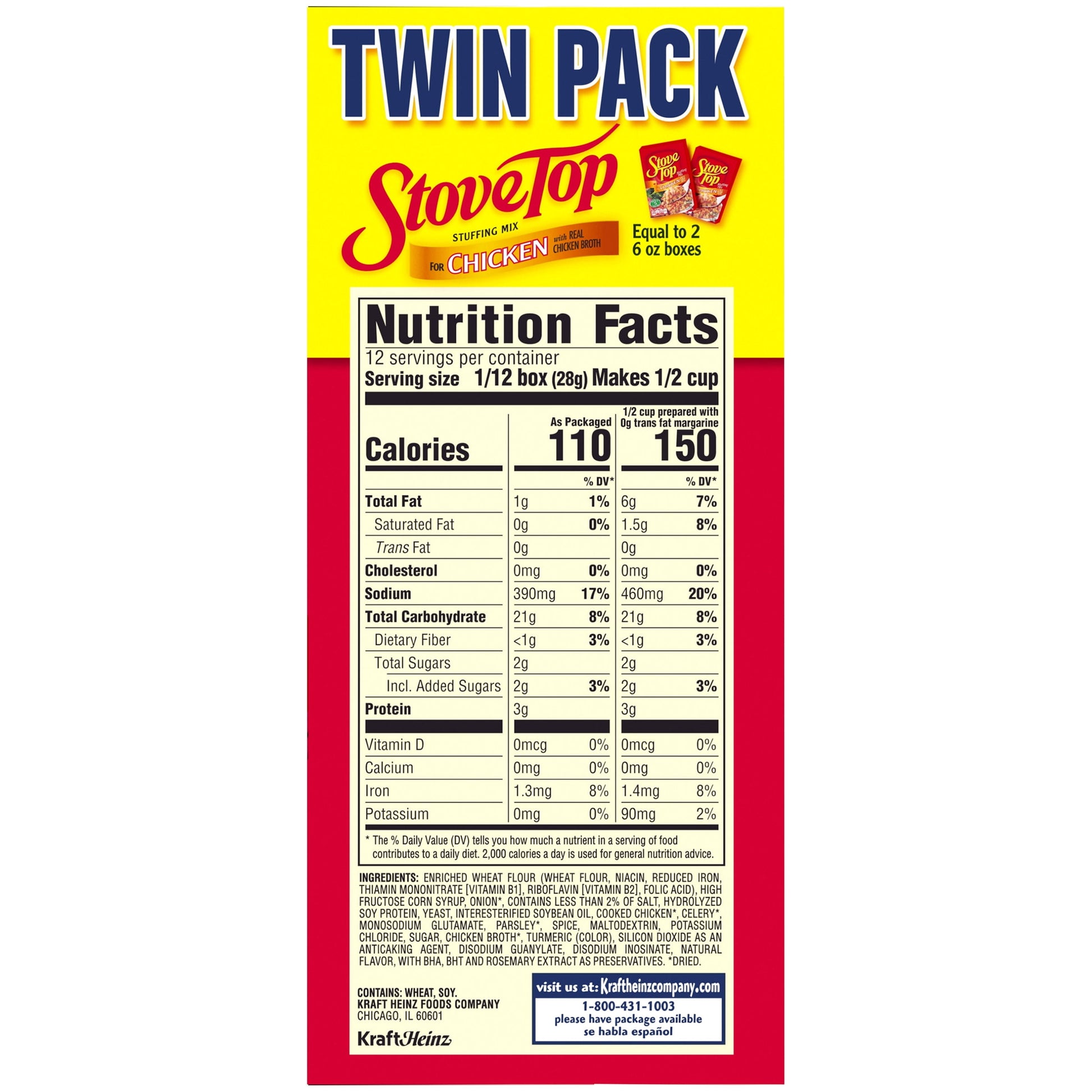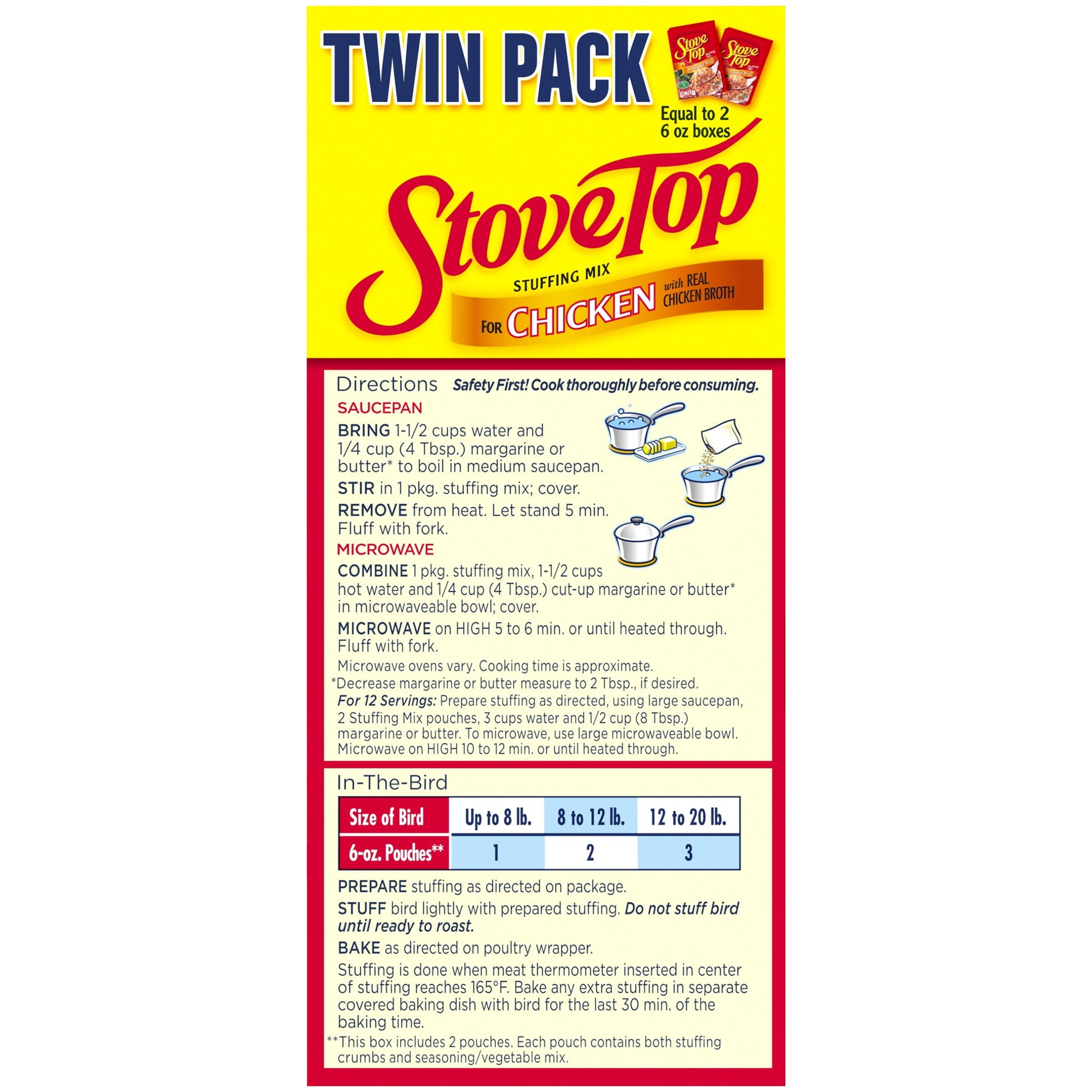 Make any family dinner something to celebrate with Stove Top Chicken Stuffing Mix sides. A blend of fresh baked bread crumbs with chicken broth is the perfect pairing for roast chicken delivering a soft, fluffy texture in every forkful. Each box of Stove Top stuffing comes packed with a dry, pre-seasoned stuffing mix. Simply add water and butter or margarine for a stuffing side dish that tastes like it was made from scratch! Stove Top stuffing can also be conveniently prepared in the microwave. Delicious served as is, along with other dinner sides or in recipes such as a bruschetta chicken bake. Our 12 oz box is equal to two 6 oz boxes of stuffing and makes twelve servings. Enjoy with your Thanksgiving turkey or as an additional side dish to any meal year round.