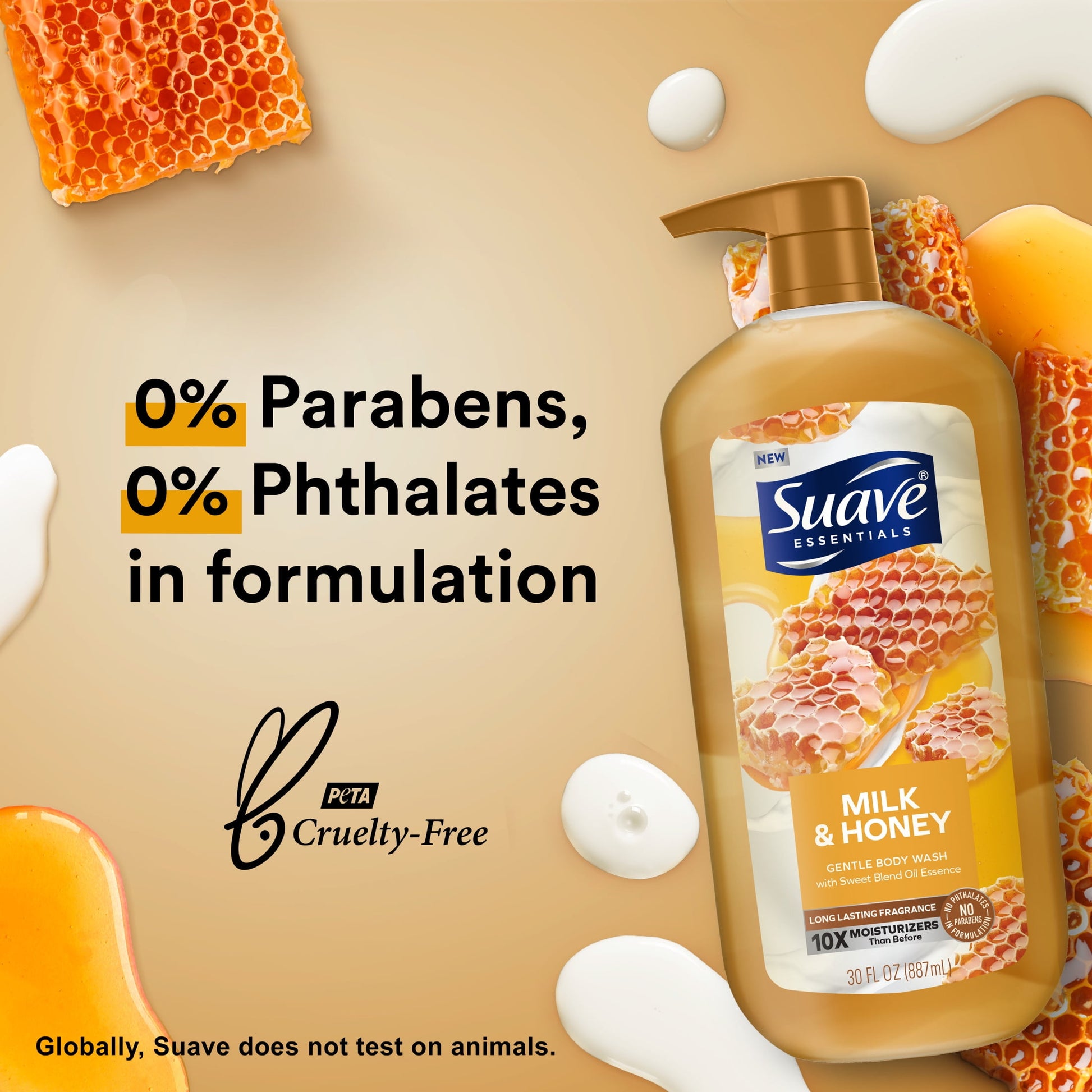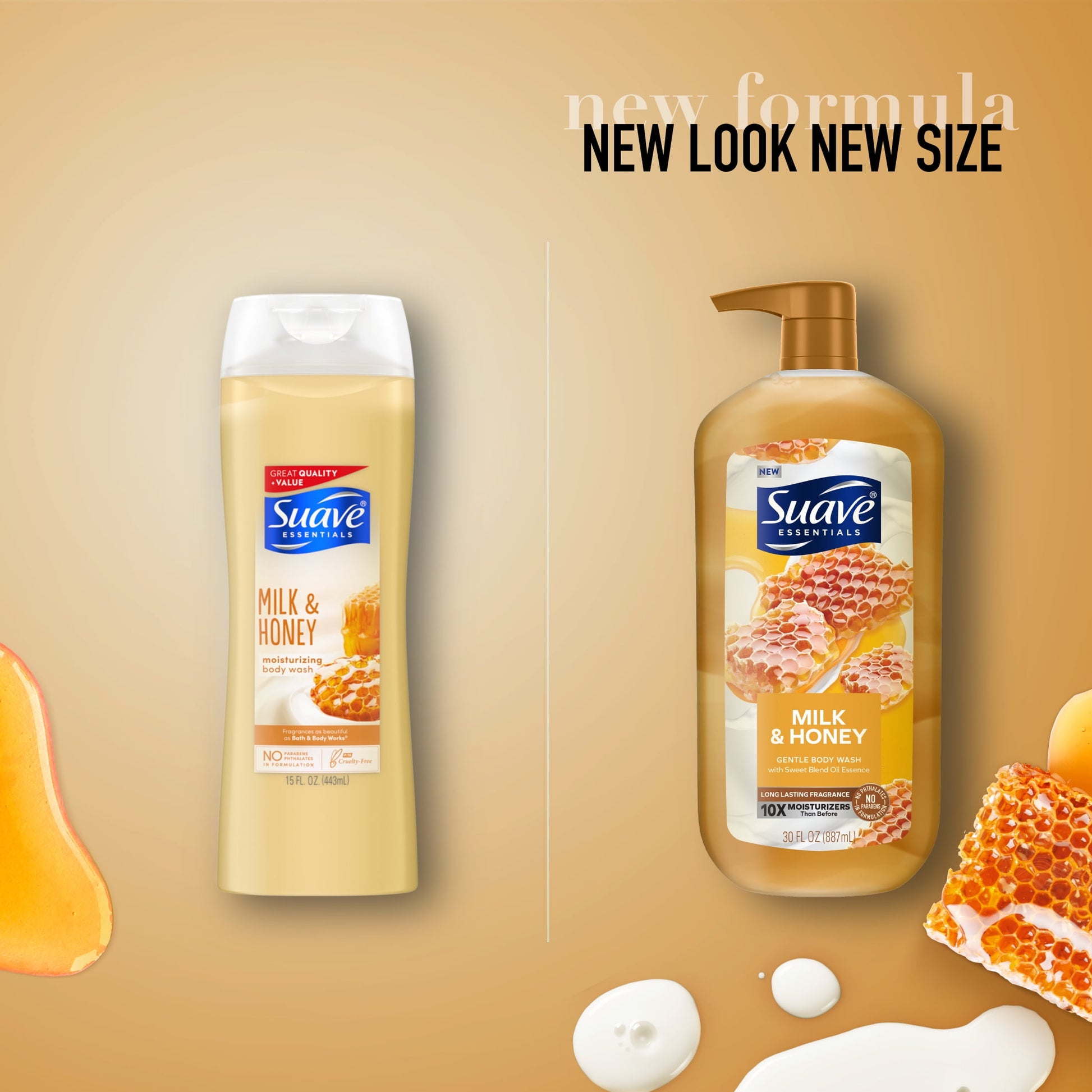 Allow us to reintroduce ourselves! Suave Essentials Body Washes are now new and improved! New look, new sizes, and even more benefits. Fresh, Floral, Fruit, Sweet, oh my! With our new fragrance families, finding your go-to scent is as easy as pie. Our Milk & Honey Body Wash is creating quite the bubbly buzz! Combining the intoxicating scents of pure vanilla bean and sweet honey, this delicious body cleanser features a long-lasting scent you'll love all day-long. With a sweet blend of oil essence, your skin will feel instantly hydrated and silky smooth. Now rich with 10X the moisturizers than before, and infused with Vitamin E and honey extracts, you'll pamper your skin with every use of this body soap.
